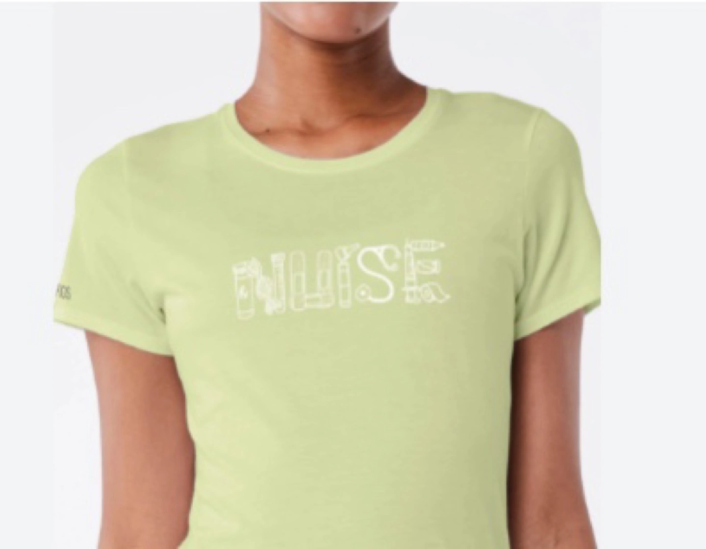 Women's short sleeve t-shirt. Light green colour. Features a graphic design spelling out "NURSE" using medical tools.