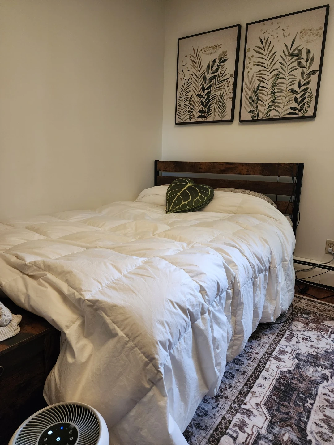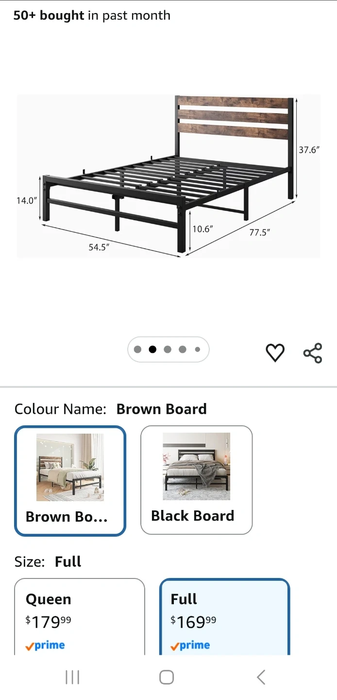 Full-size metal bed frame with a rustic vintage wood headboard. It's designed for heavy-duty support with strong metal slats. The frame is noise-free and easy to assemble. Only used for 1 year. Mattress is old but can be included for free.