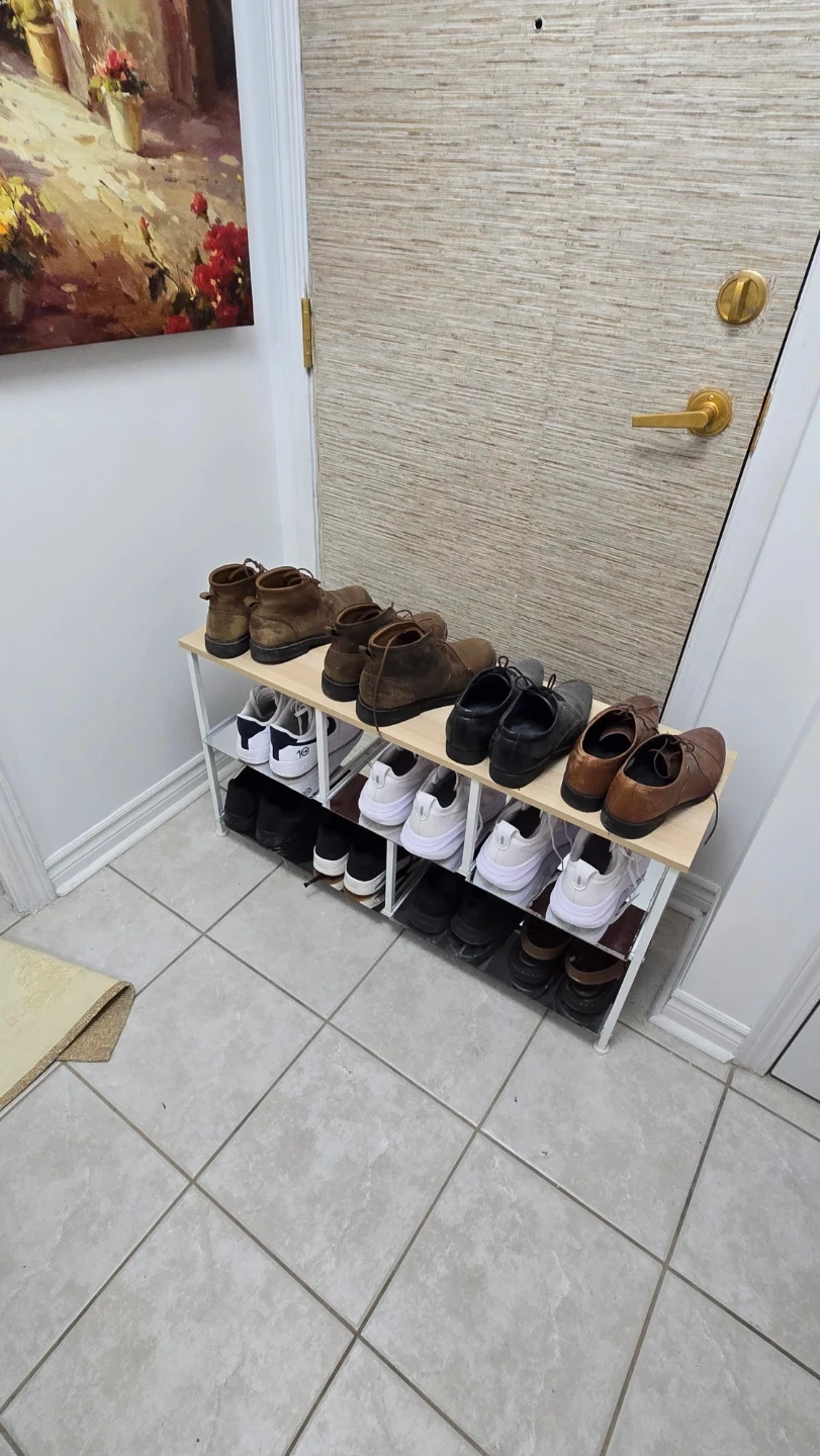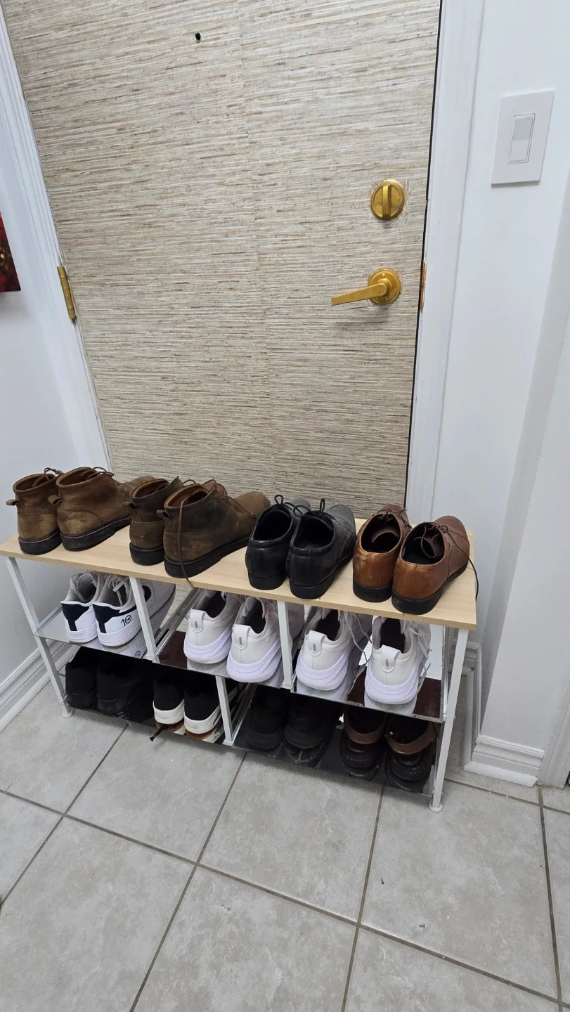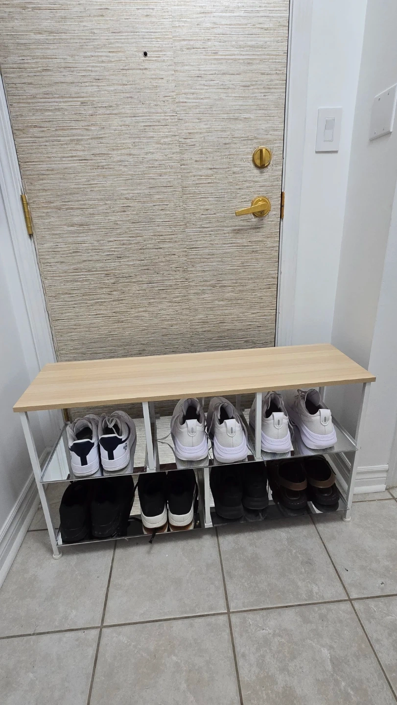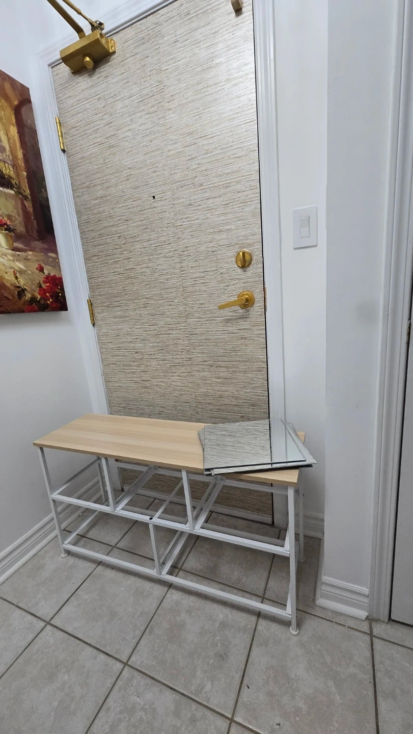 A handy 3-tier shoe rack for your entryway! It's made with a wooden top shelf and a metal frame, perfect for keeping your shoes tidy. The mirror tiles are used as shelf. Mirrors need to be cleaned, they can come out.
