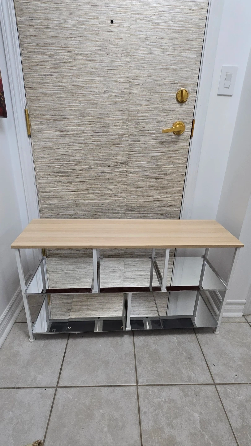 A handy 3-tier shoe rack for your entryway! It's made with a wooden top shelf and a metal frame, perfect for keeping your shoes tidy. The mirror tiles are used as shelf. Mirrors need to be cleaned, they can come out.