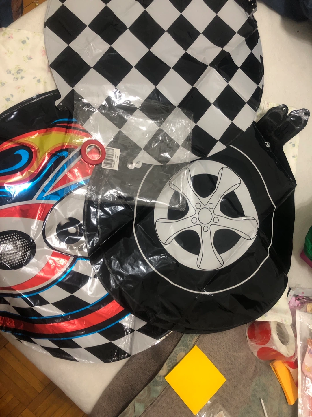 Get ready to rev up the party with this set of three racing-themed foil balloons! One features a cool motor helmet design, another has a classic checkered flag pattern, and the third showcases a sleek wheel design. Perfect for birthday parties or any racing event!
