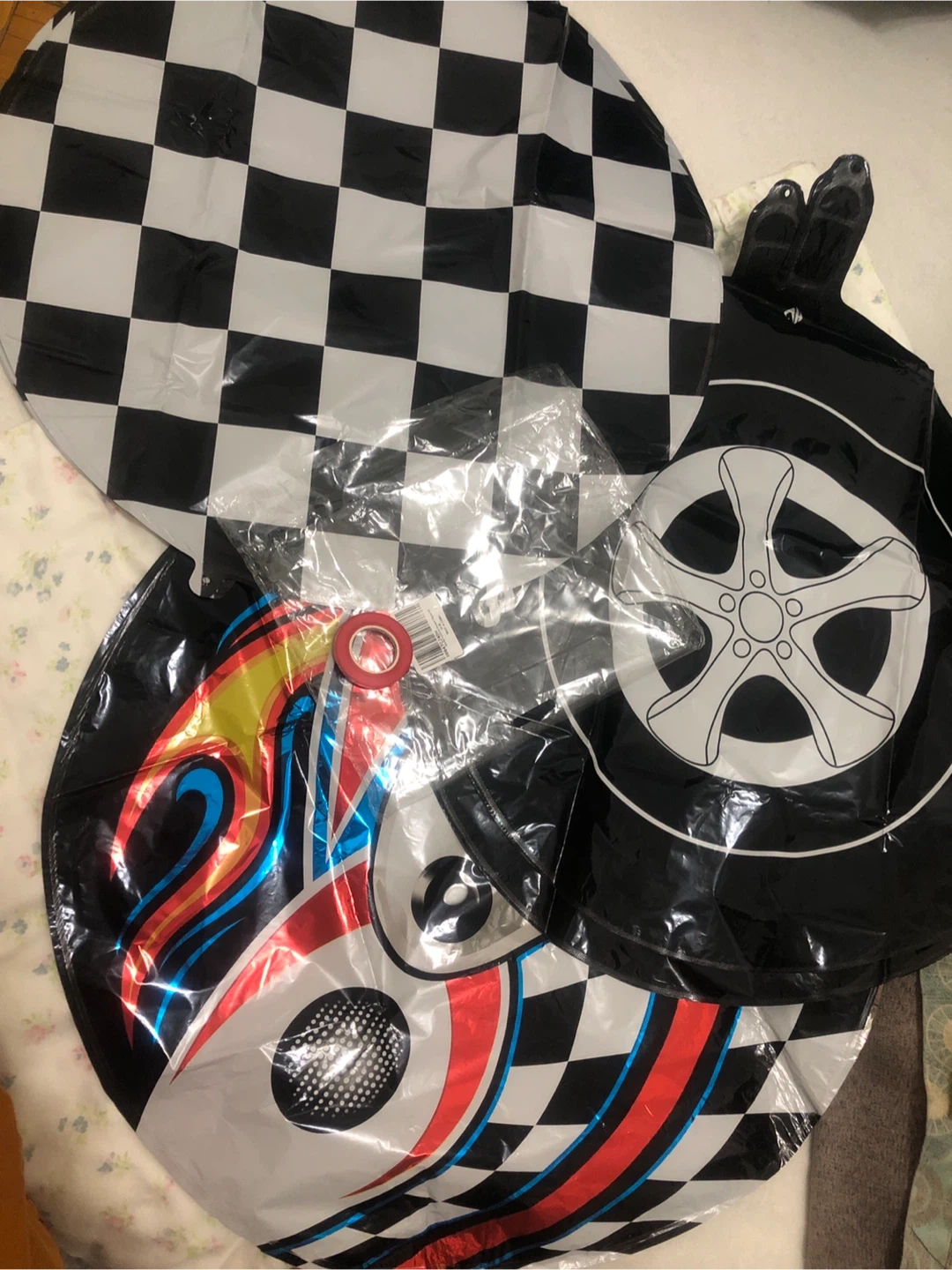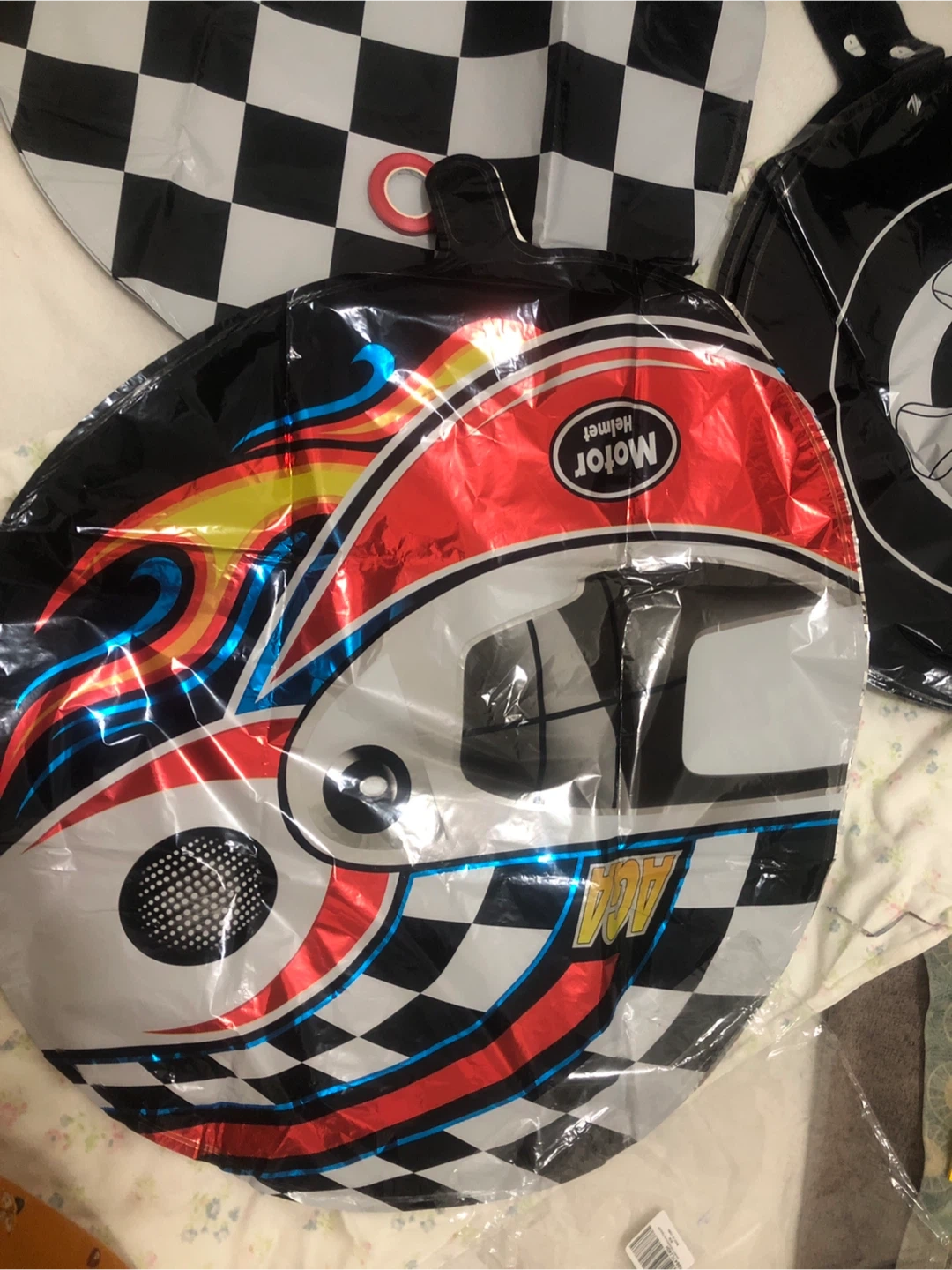 Get ready to rev up the party with this set of three racing-themed foil balloons! One features a cool motor helmet design, another has a classic checkered flag pattern, and the third showcases a sleek wheel design. Perfect for birthday parties or any racing event!