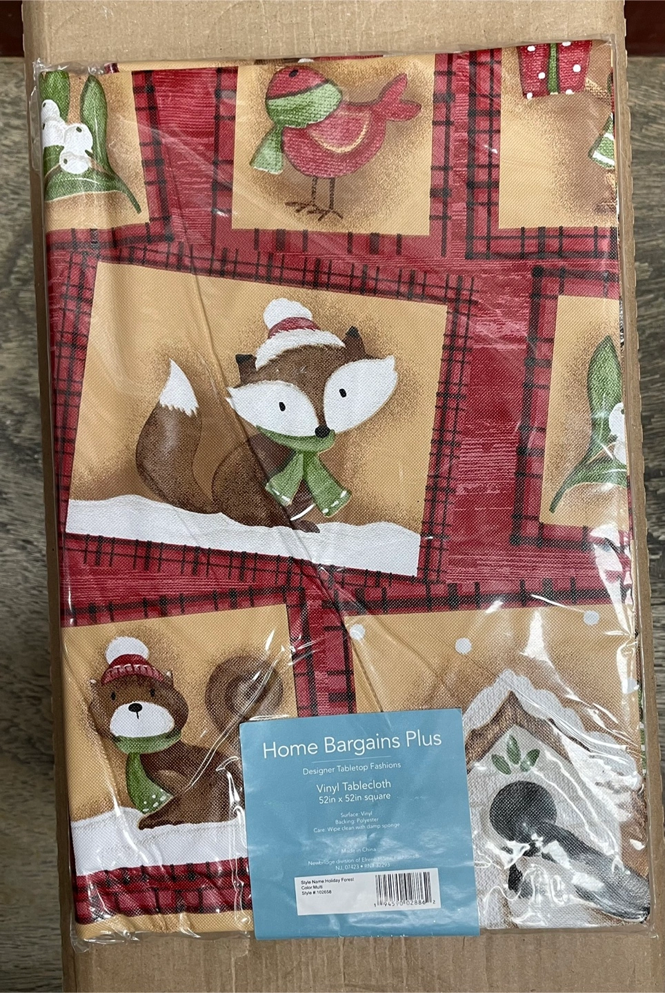 This vinyl tablecloth features a charming holiday design with woodland creatures. It's 52 inches square, making it a practical size for many tables. The surface is vinyl for easy cleaning. Perfect for adding a festive touch to your dining area during the holiday season!