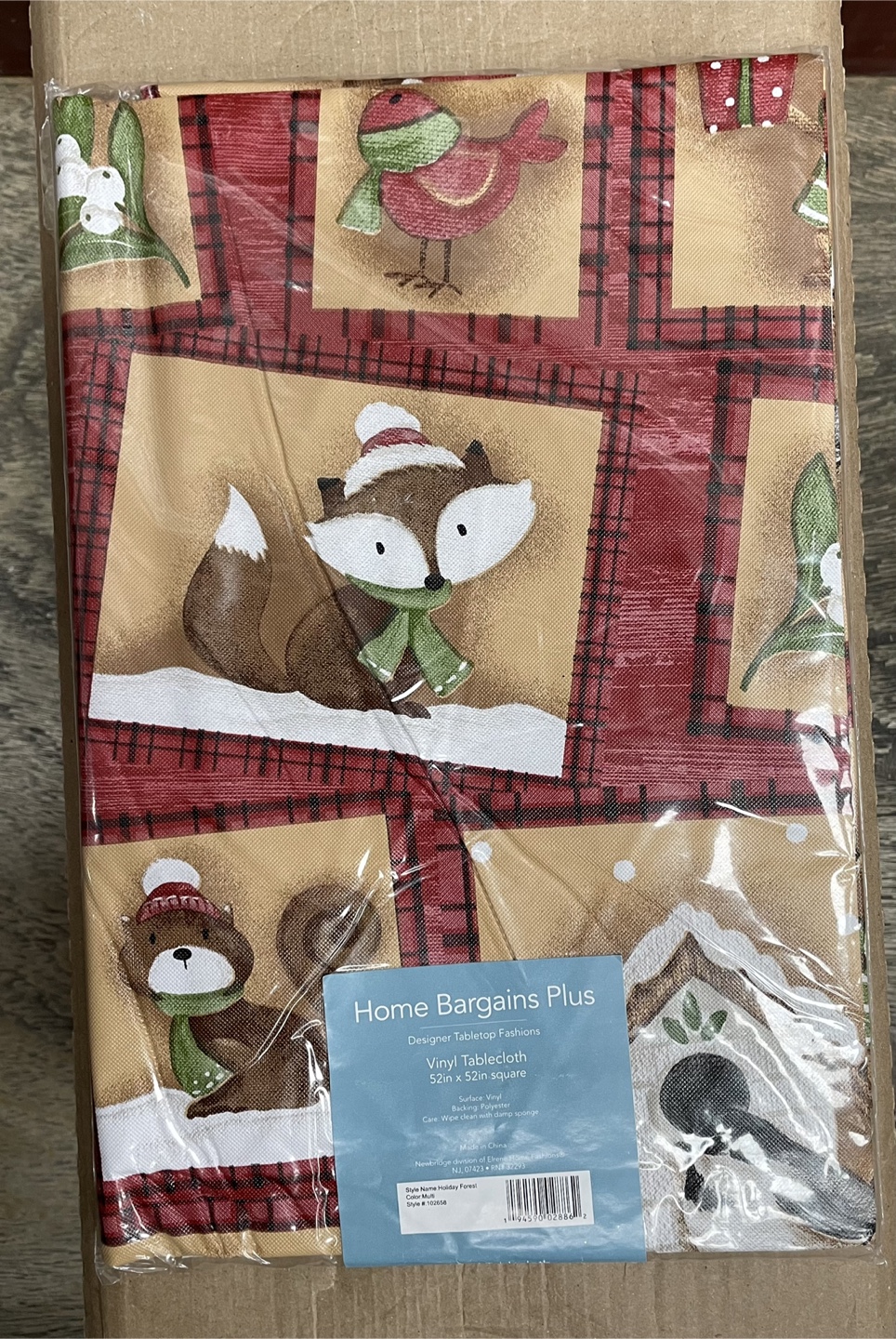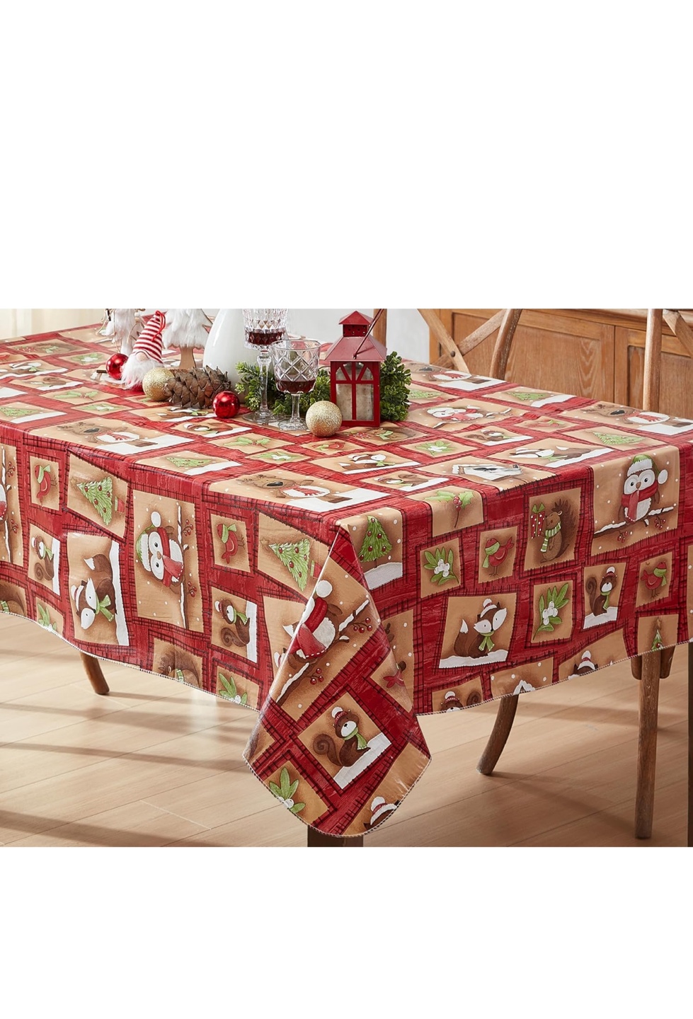 This vinyl tablecloth features a charming holiday design with woodland creatures. It's 52 inches square, making it a practical size for many tables. The surface is vinyl for easy cleaning. Perfect for adding a festive touch to your dining area during the holiday season!