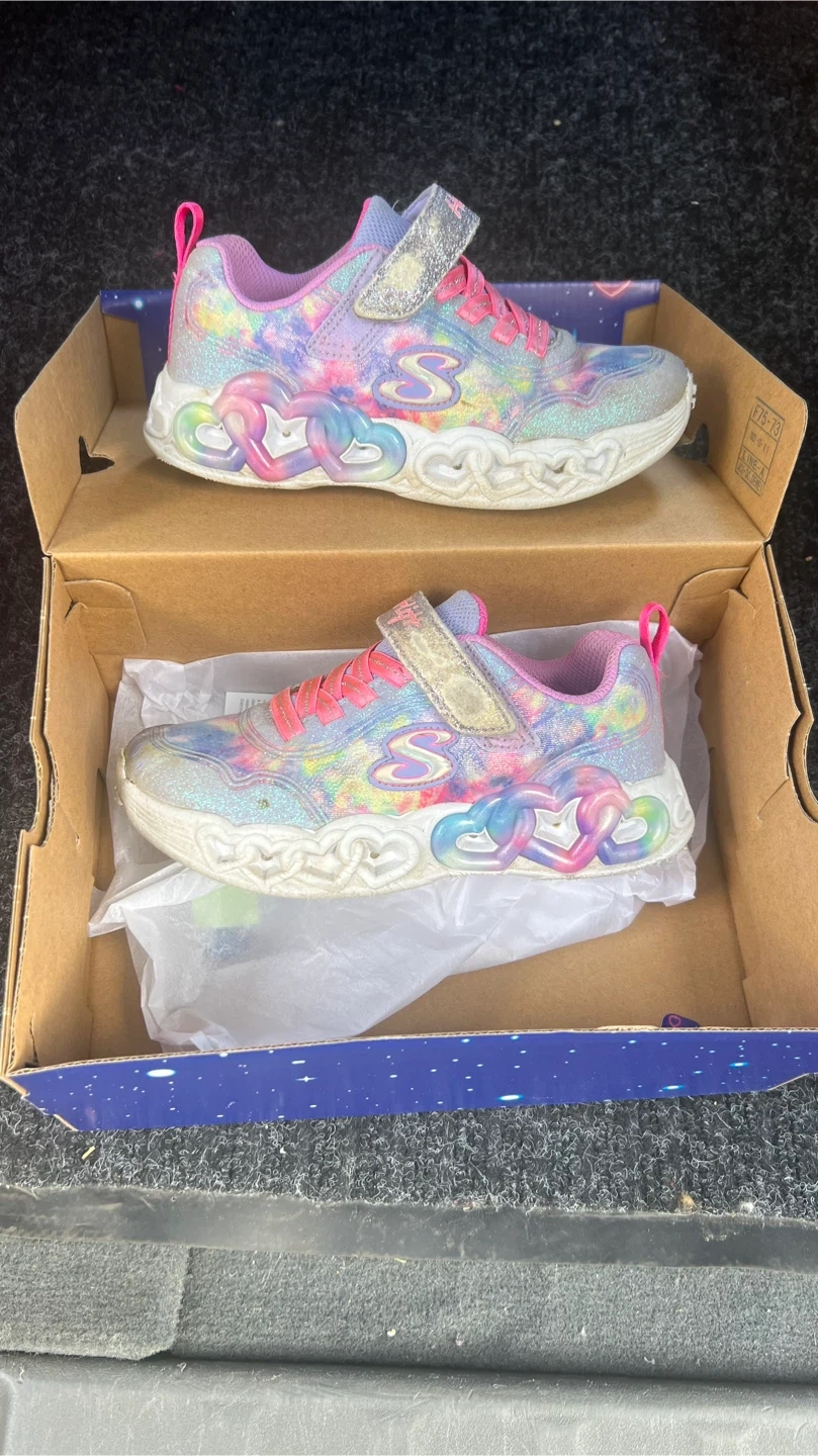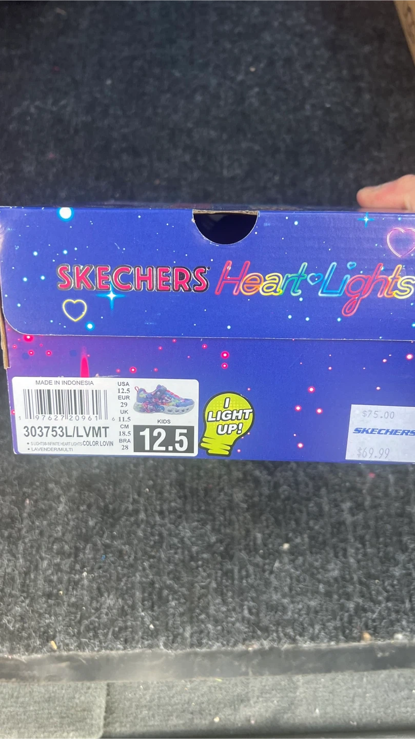 Selling a pair of Skechers Heart Lights in a kids size 12.5! They are lavender and multi-coloured and come with the original box. The box indicates they originally retailed for $75. These shoes light up!