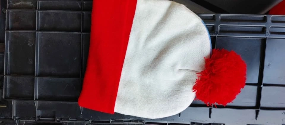 Fun ski-themed beanie! Has LED lights that cycle through different patterns, super cool for winter. Red, white, and blue with a fluffy red pom-pom. Great for slopes or just staying warm.