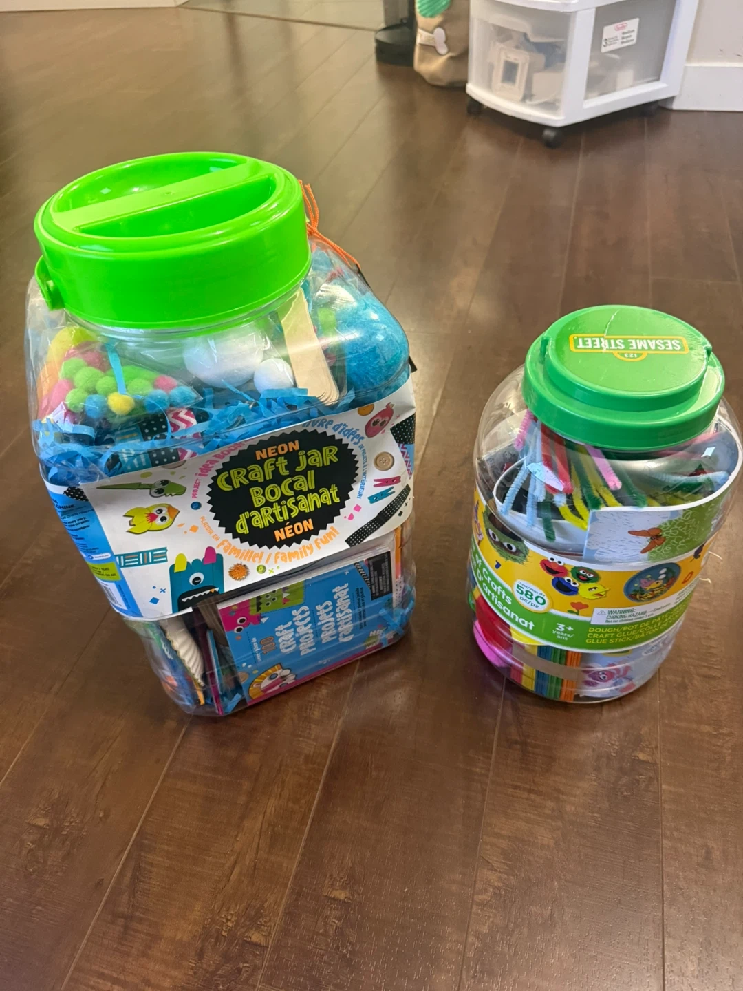 Two craft jars filled with assorted crafting supplies. One is a Neon Craft Jar with a variety of neon-coloured items. The other is a Sesame Street themed craft jar with 580 pieces, recommended for ages 3+.