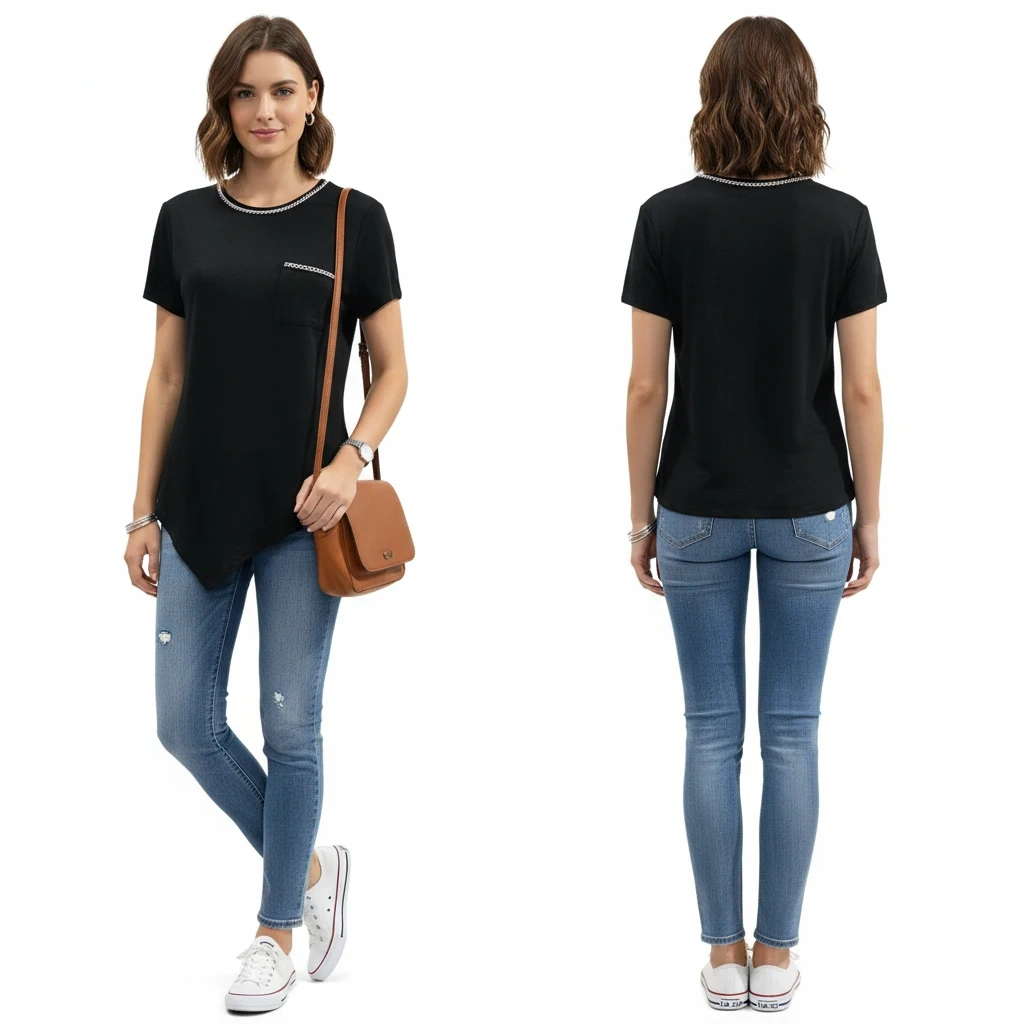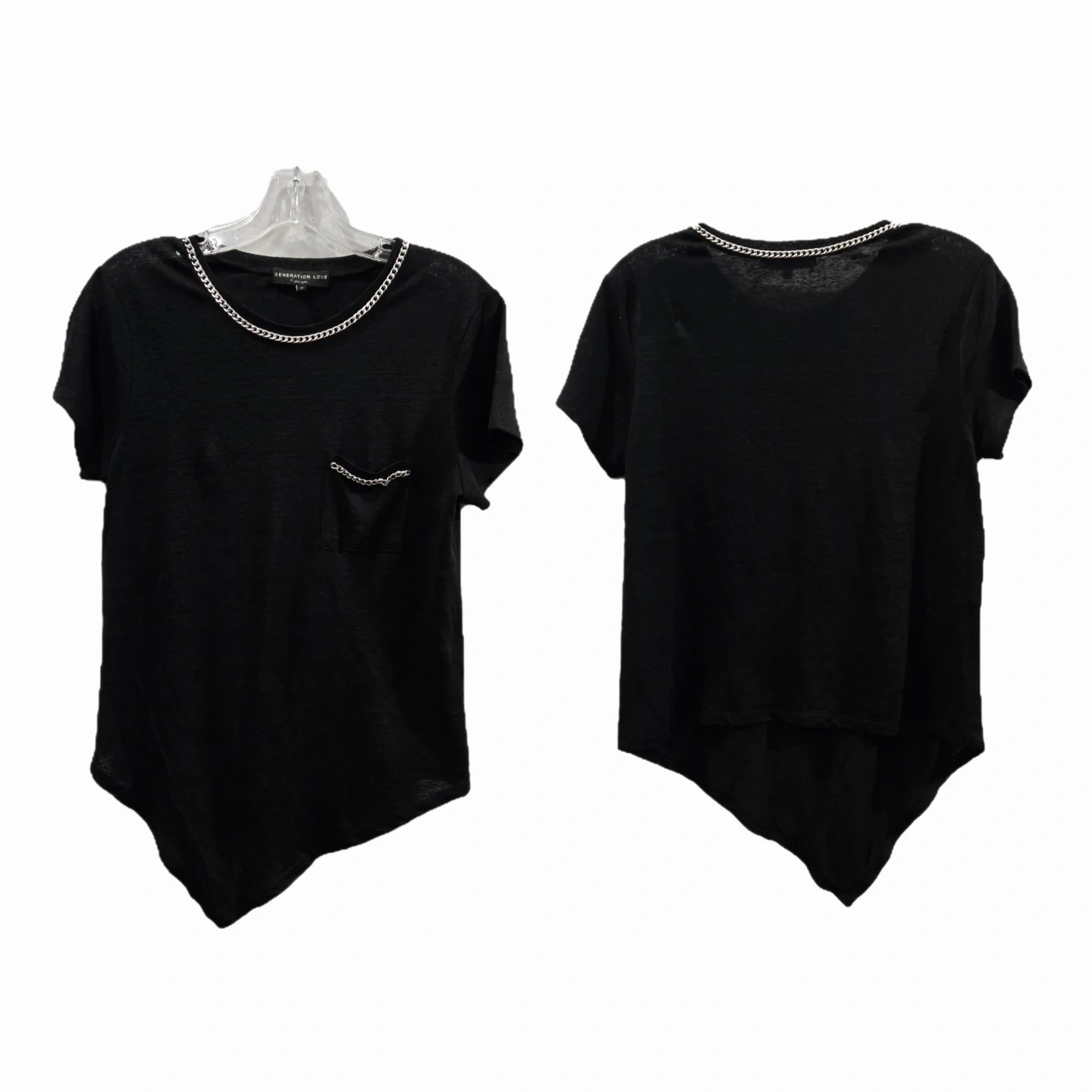 Features: Functional chest pocket, chain-link detailing, soft-knit feel, asymmetrical hemline.