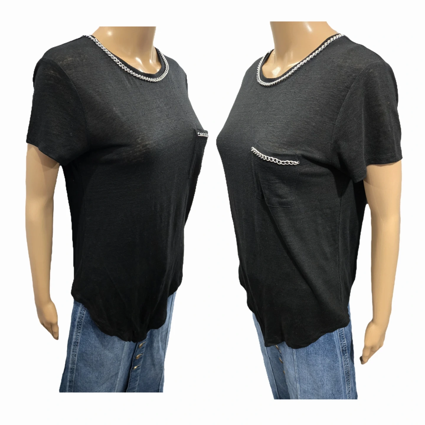 This isn't your average black T-shirt; it features a chic silver-tone curb chain trim along the neckline and the chest pocket for a touch of New York edge.