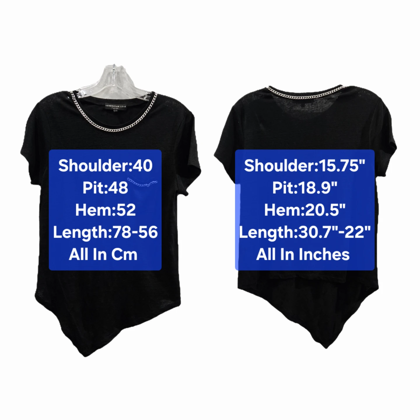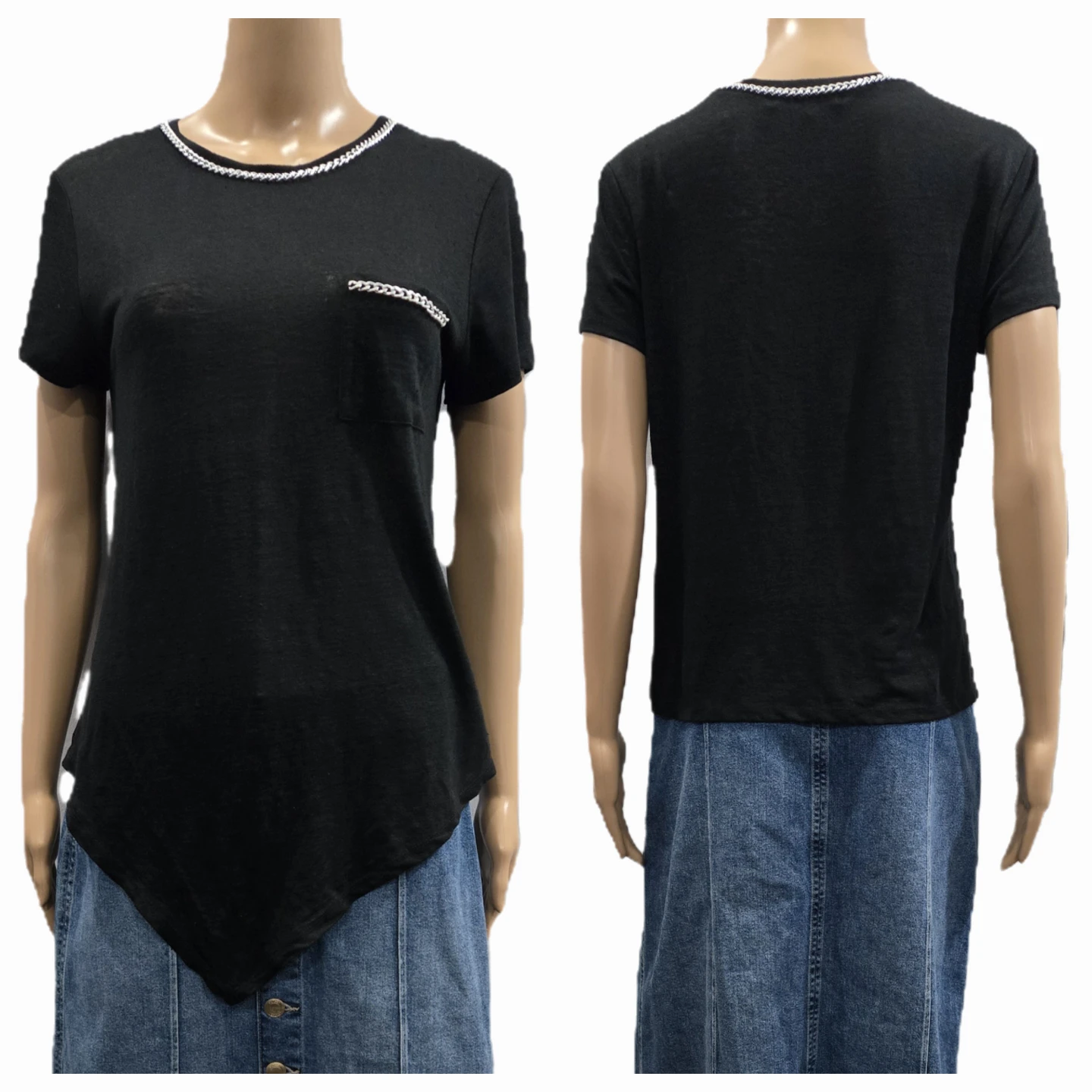 Features: Functional chest pocket, chain-link detailing, soft-knit feel, asymmetrical hemline.