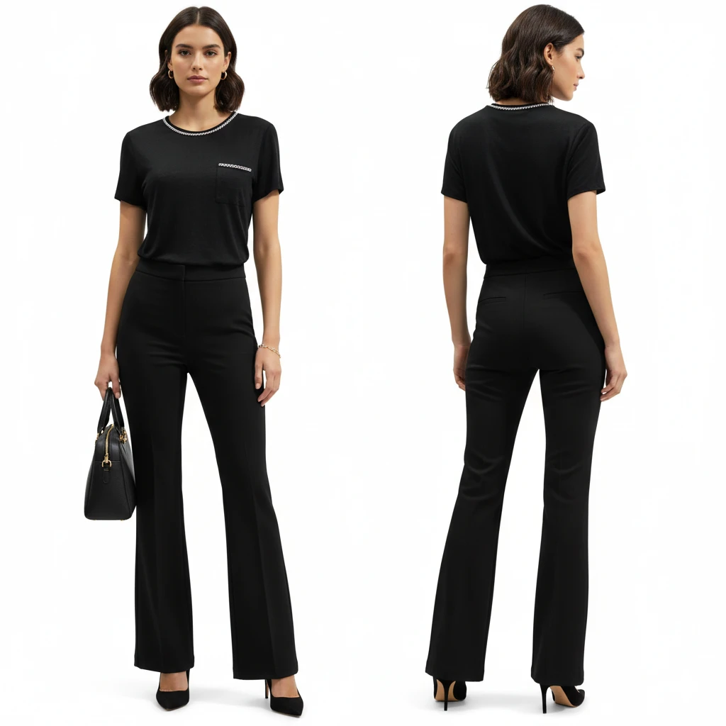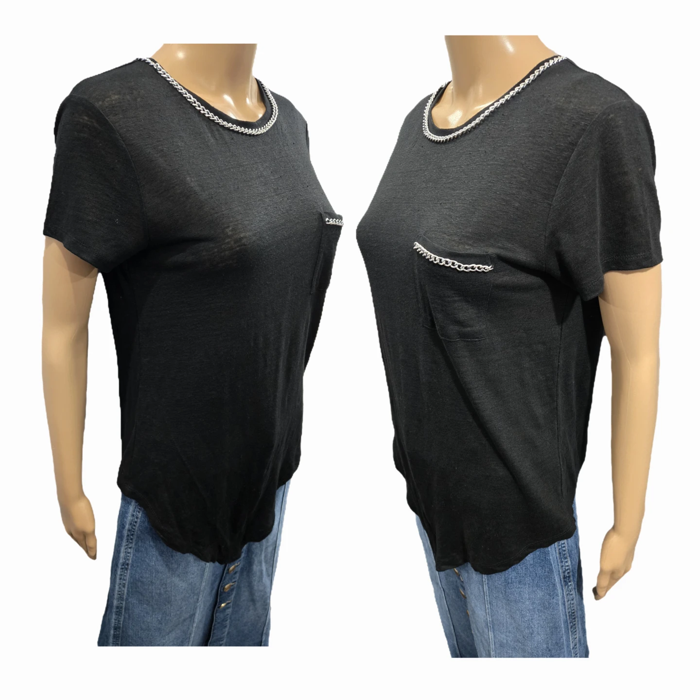 This isn't your average black T-shirt; it features a chic silver-tone curb chain trim along the neckline and the chest pocket for a touch of New York edge.