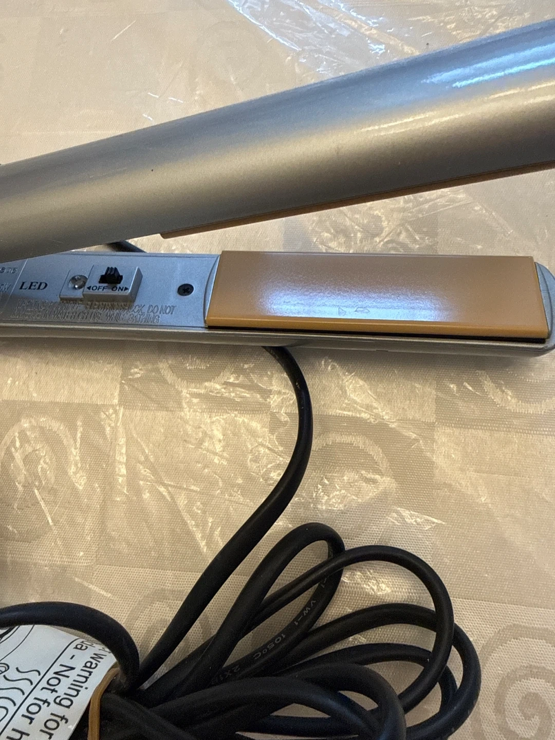 This is a CHI GF 1001 hair straightener. It has LED lights and an on/off switch.It's a 35W home appliance. Perfect for quick styling! It’s working well.