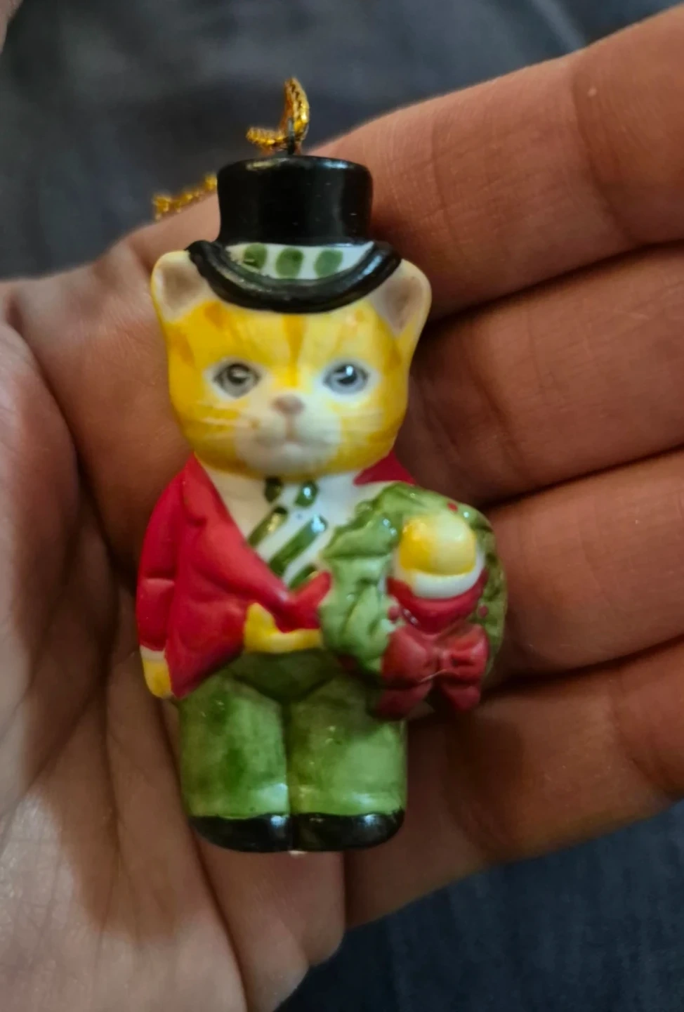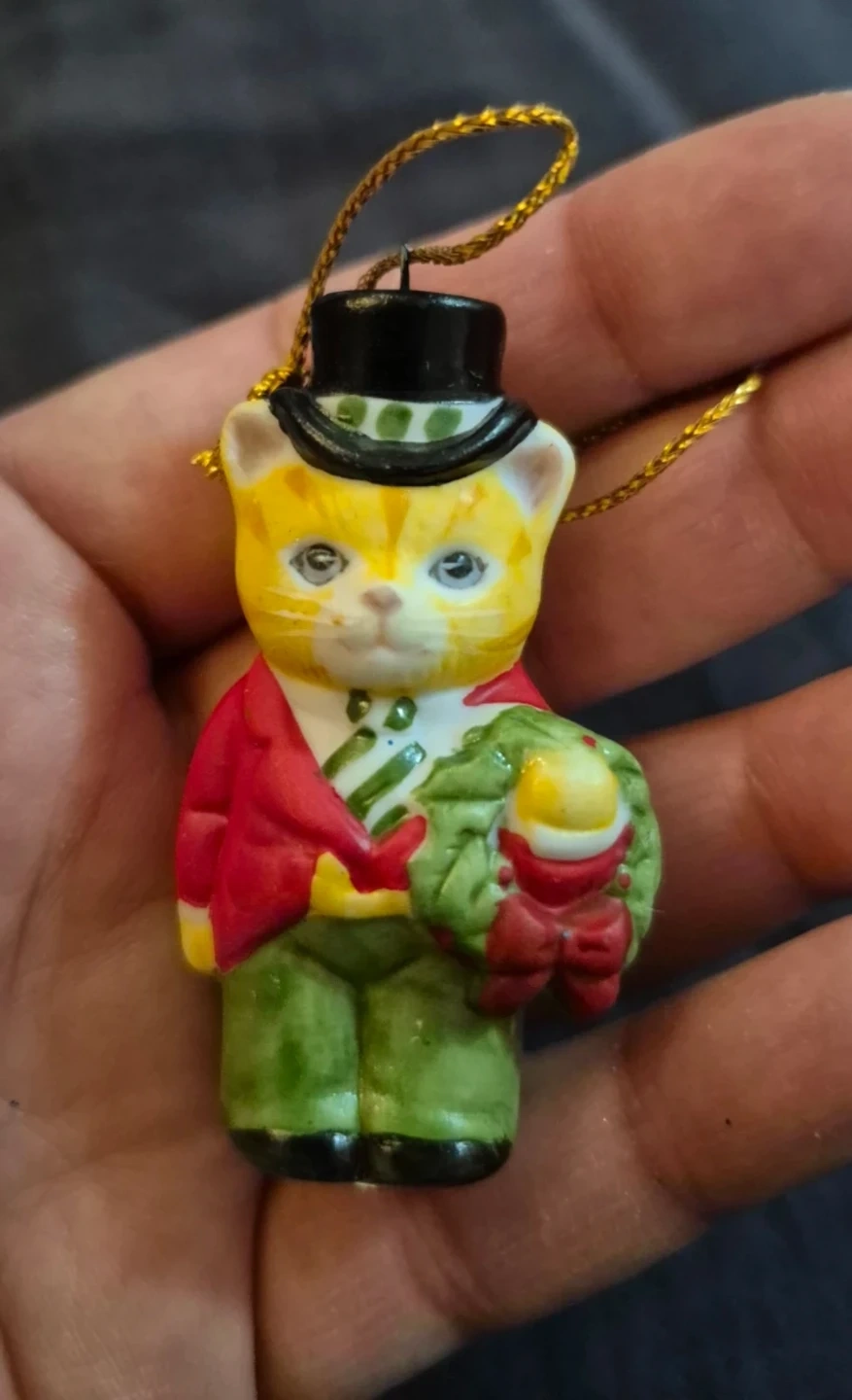 This festive ornament features a yellow cat dressed in a red jacket, green pants, and a top hat, holding a small wreath. It's perfect for adding a touch of whimsical charm to your holiday decorations! This ornament has a gold string for hanging.