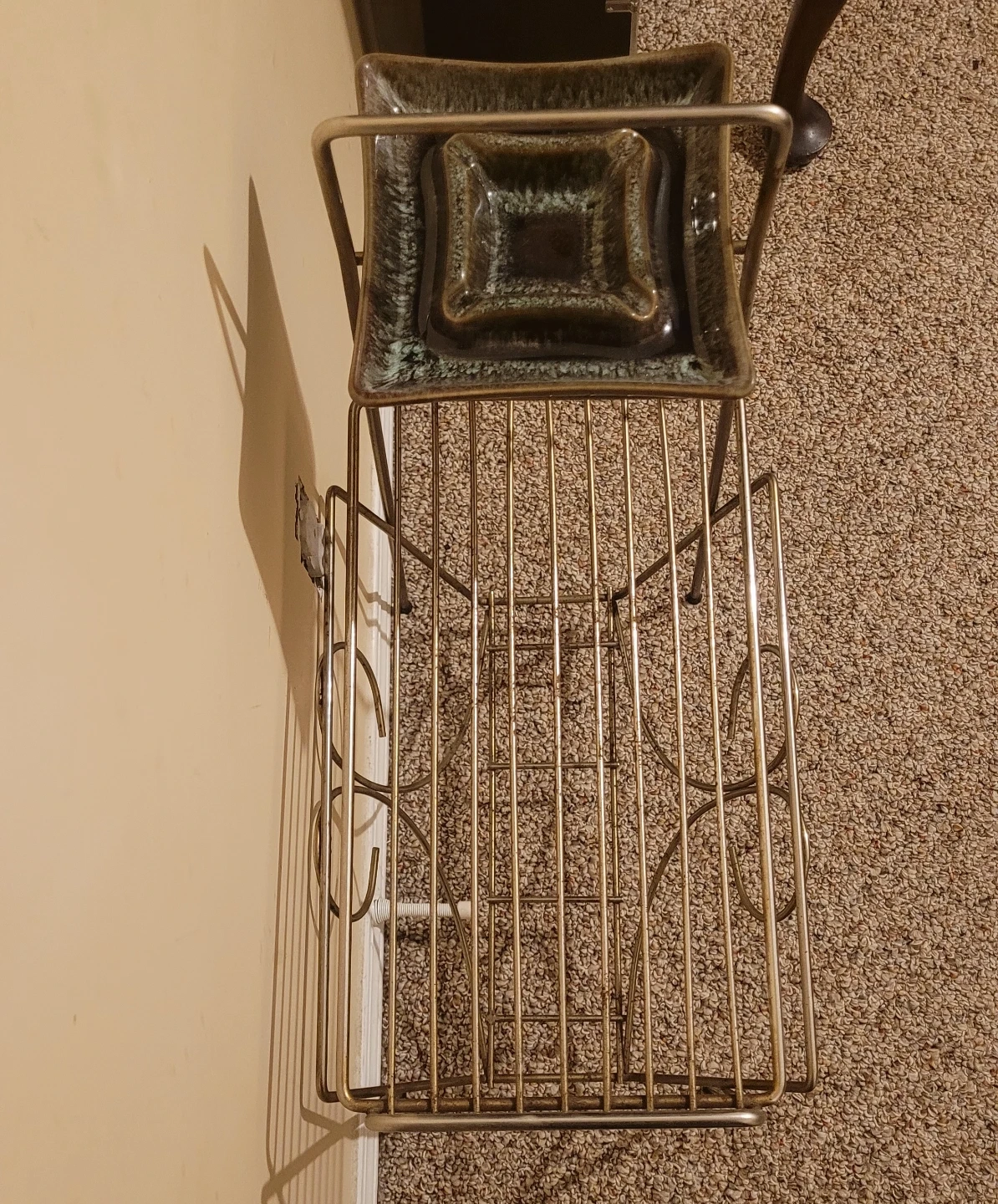Record player stand with storage underneath and an ashtray holder up top. Comes with the ashtray in the holder. In good condition.