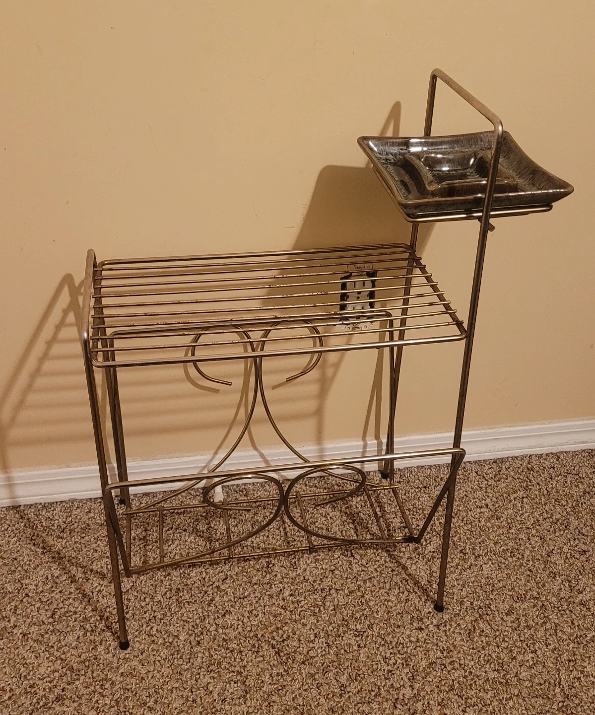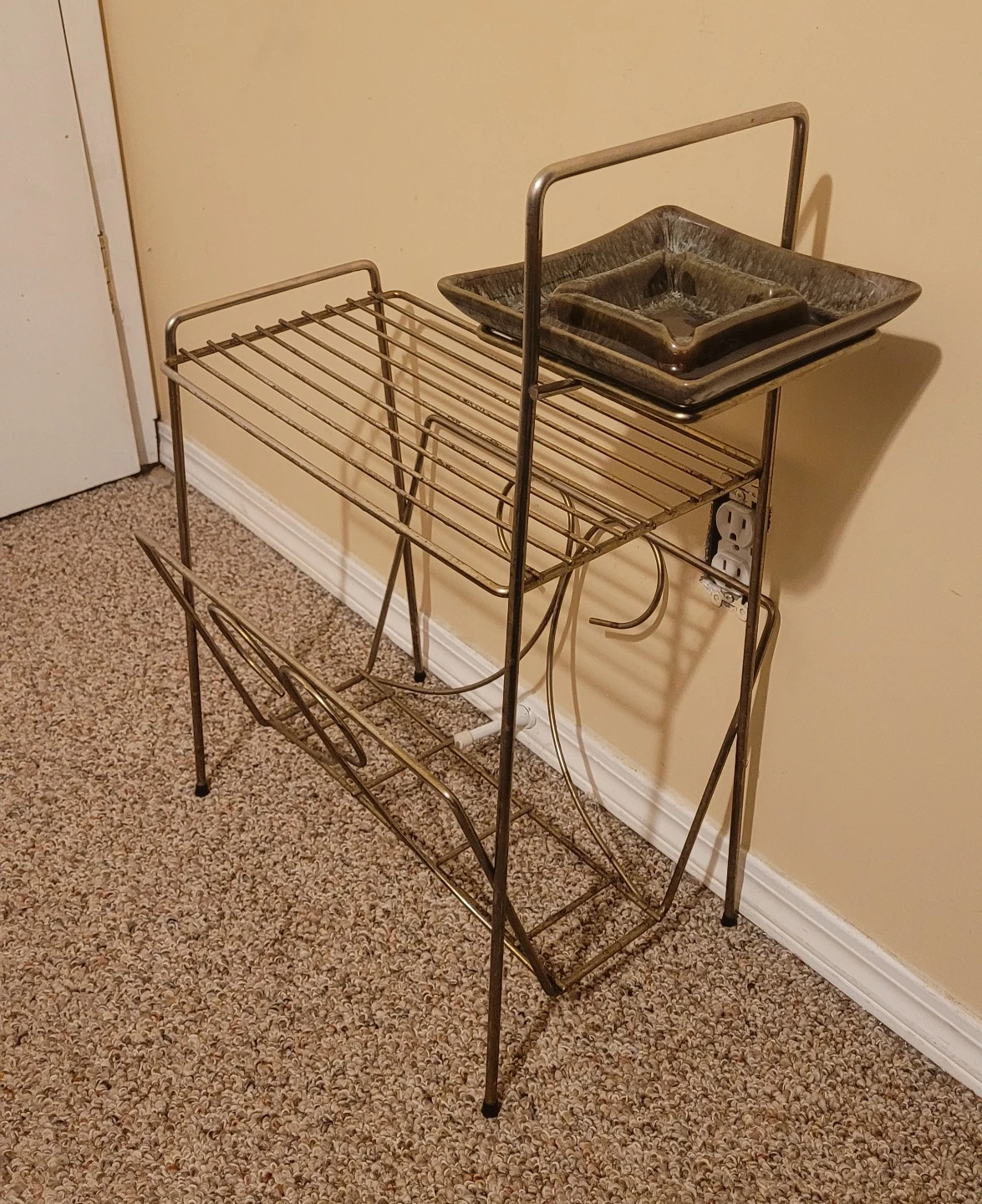Record player stand with storage underneath and an ashtray holder up top. Comes with the ashtray in the holder. In good condition.
