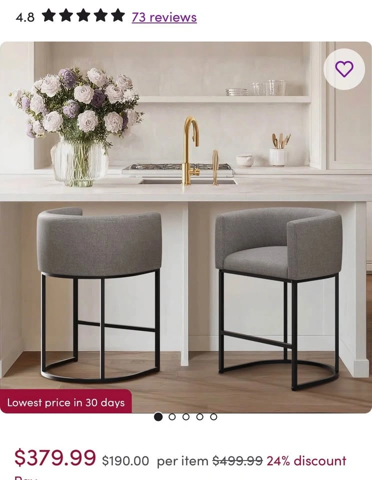 Upgrade your kitchen island with these modern curved-back counter stools featuring a soft greige fabric seat and sleek black metal base. Clean lines, comfortable wraparound design, and sturdy construction make these a perfect fit for condos and modern homes.