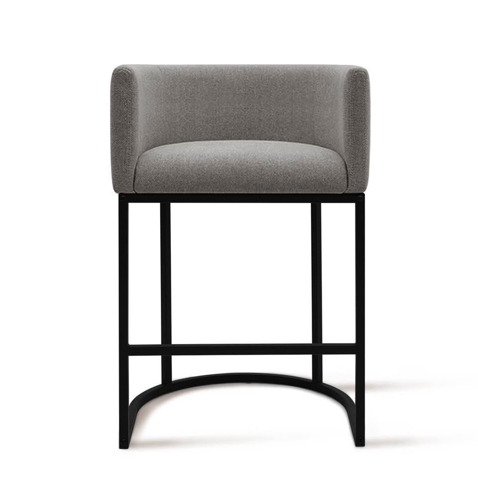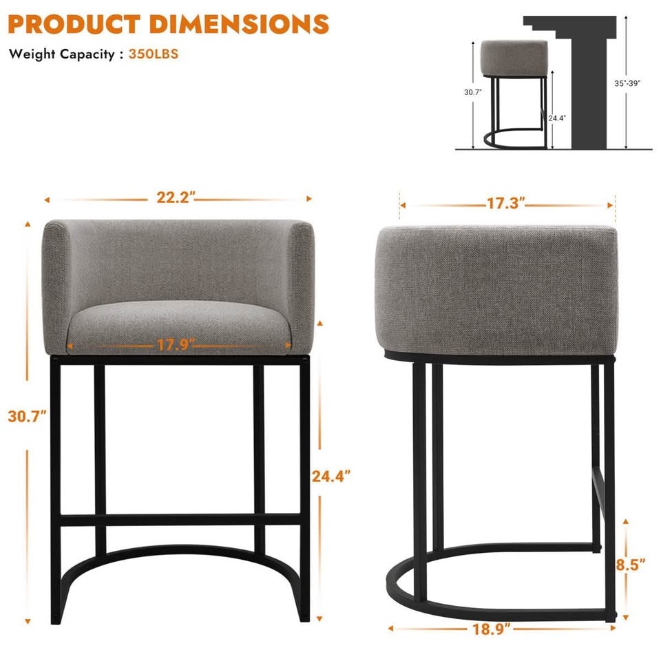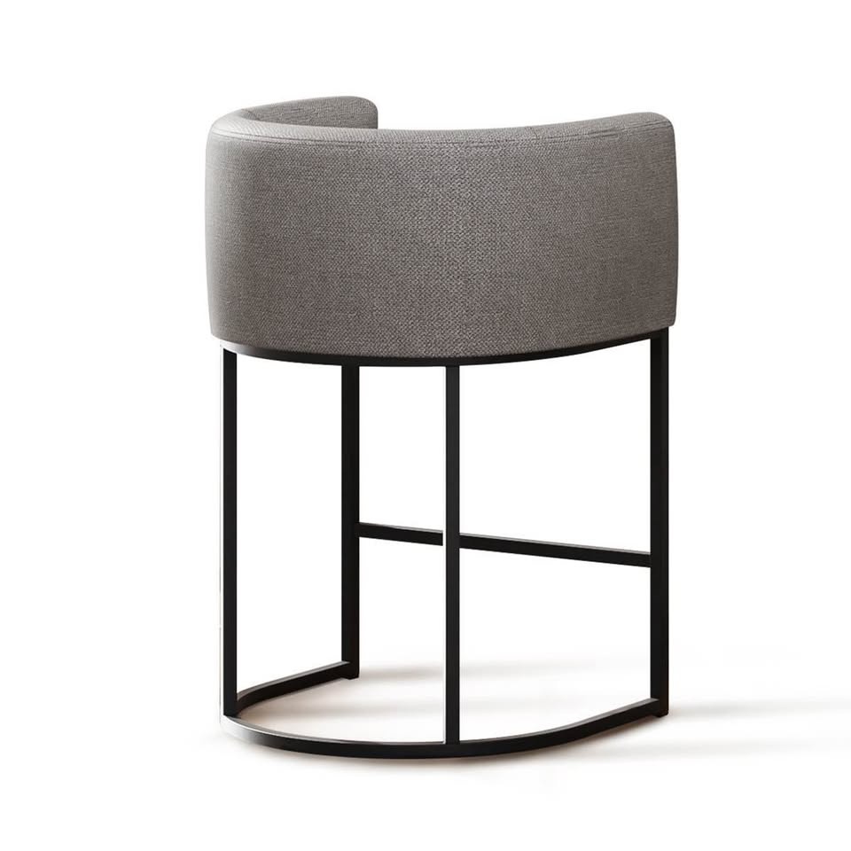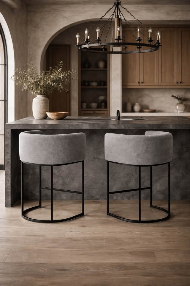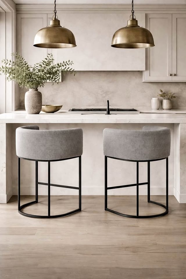 Upgrade your kitchen island with these modern curved-back counter stools featuring a soft greige fabric seat and sleek black metal base. Clean lines, comfortable wraparound design, and sturdy construction make these a perfect fit for condos and modern homes.