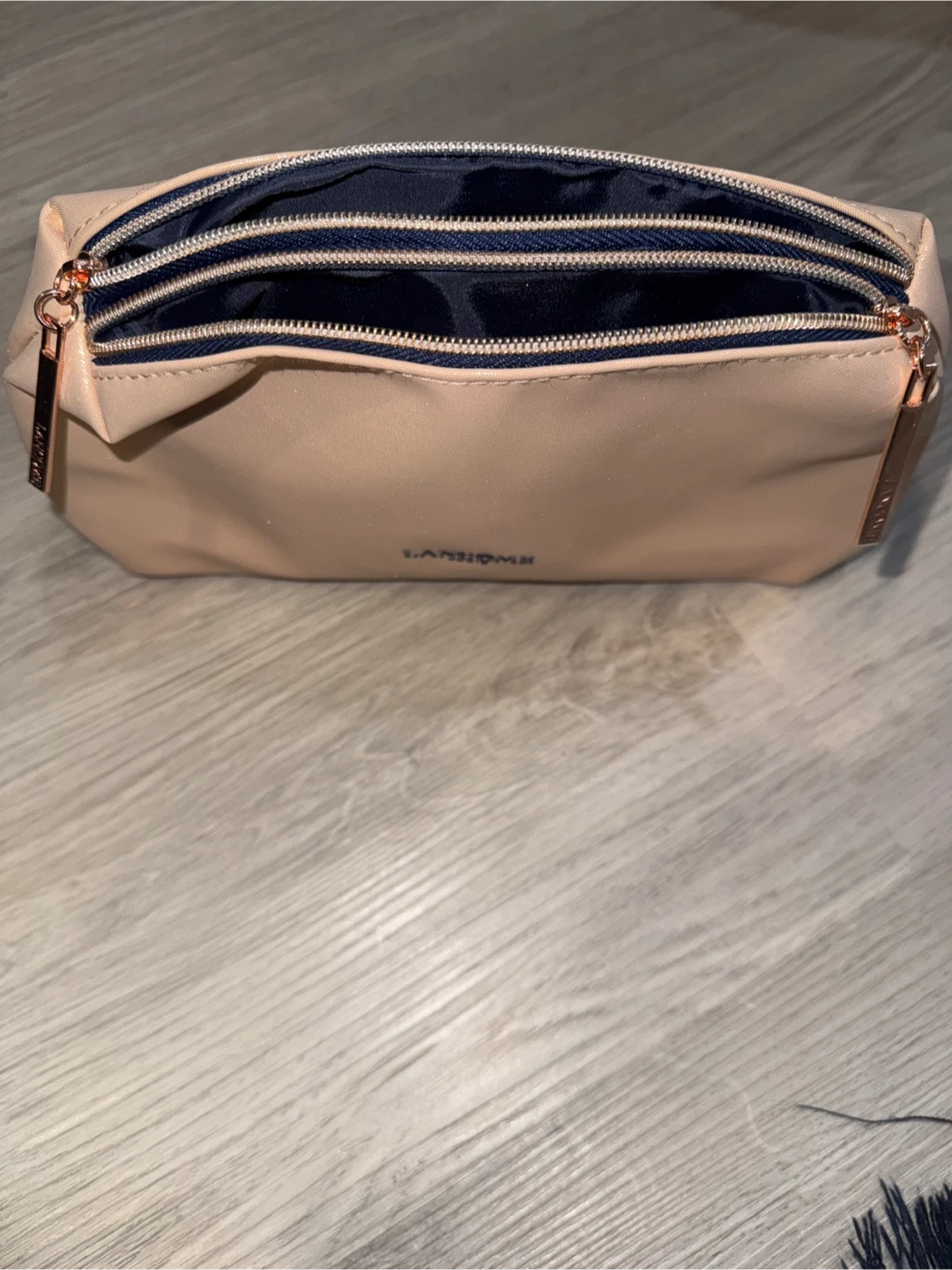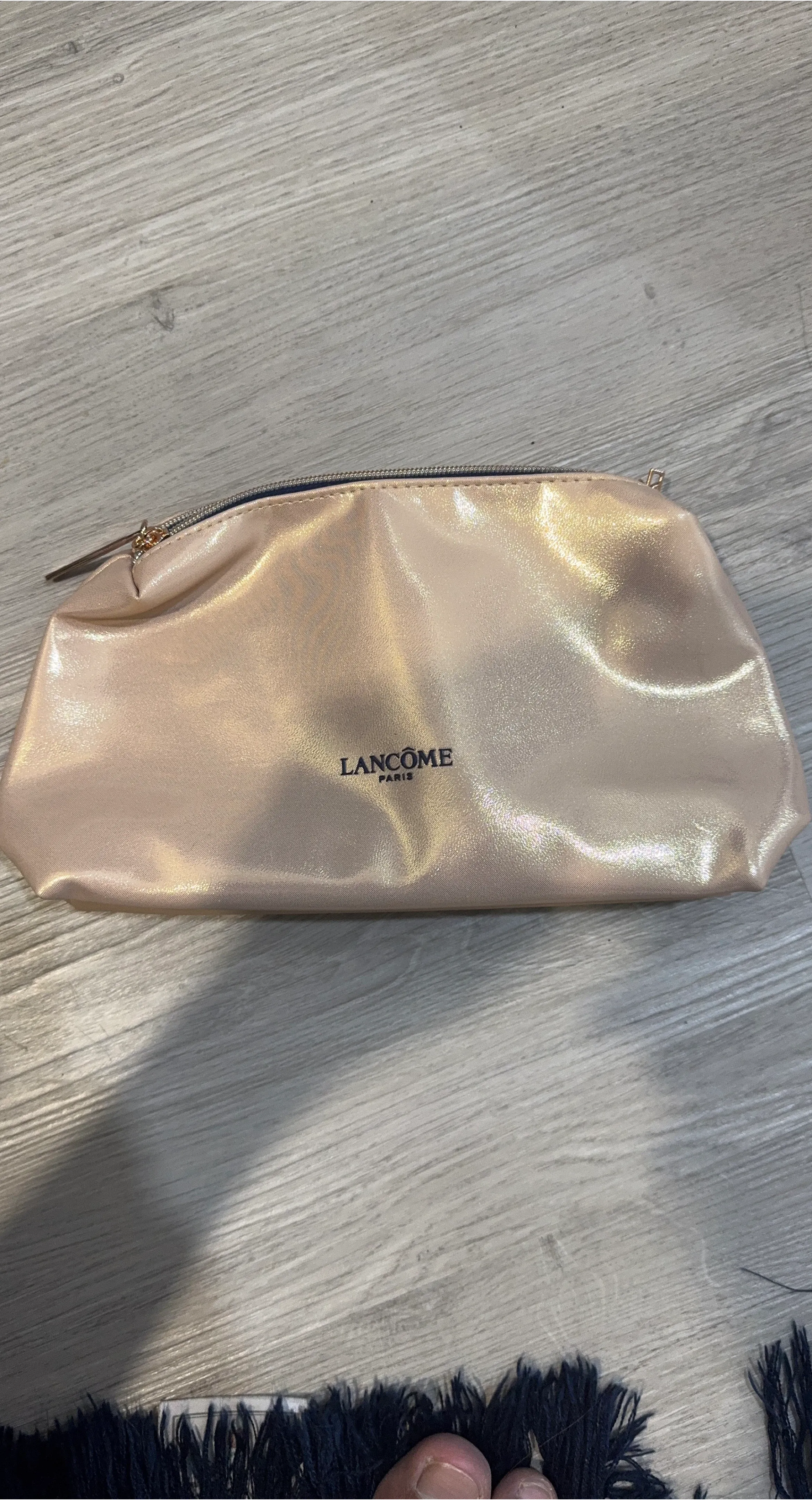 This is a shimmering rose gold makeup bag from Lancôme Paris. It features multiple zippered compartments for organization. It's perfect for travel or everyday use!