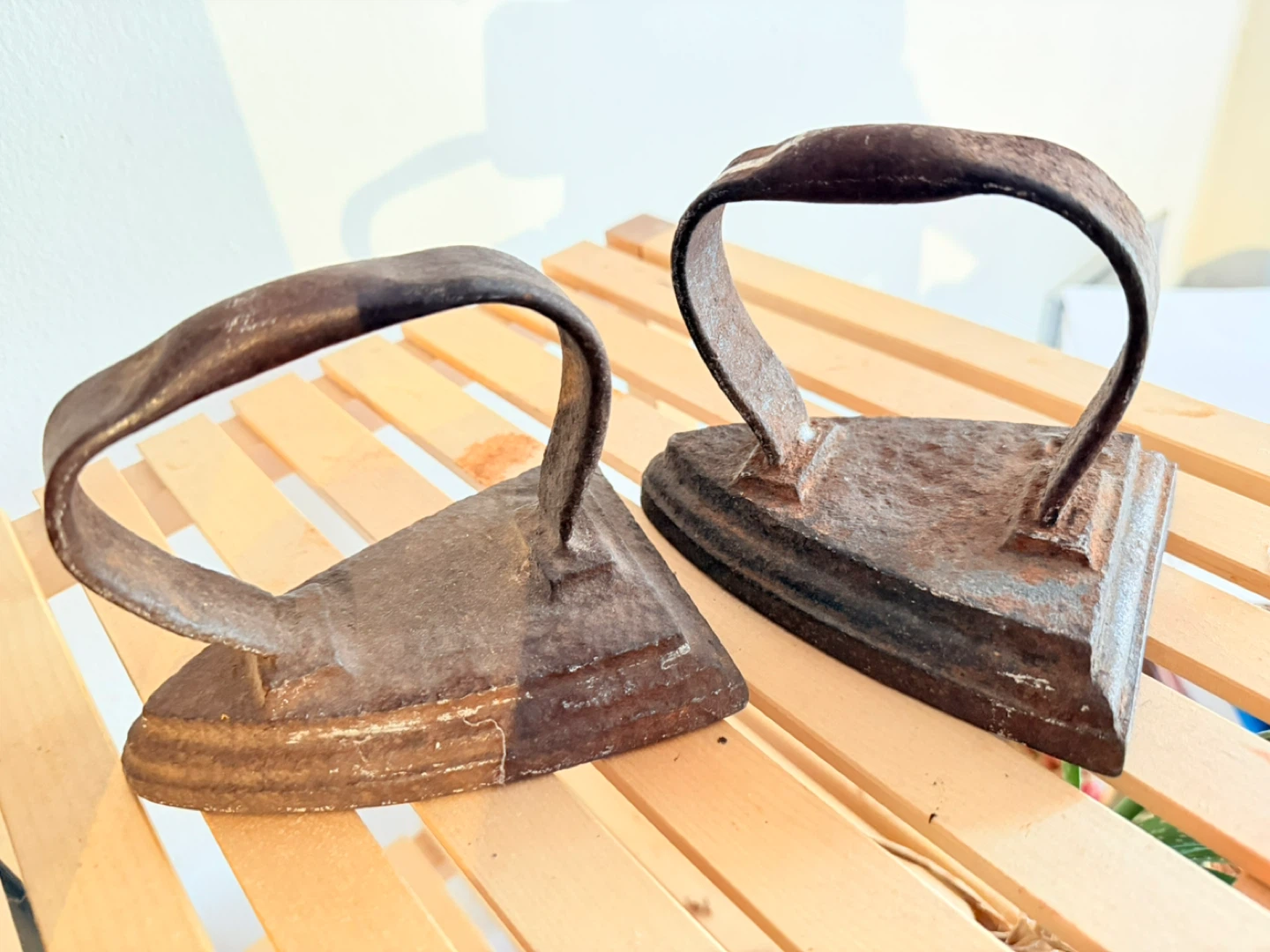 Offering two antique cast iron clothes irons. These irons are made of heavy duty cast iron with a sturdy handle. They're perfect for display or as unique decorative pieces!