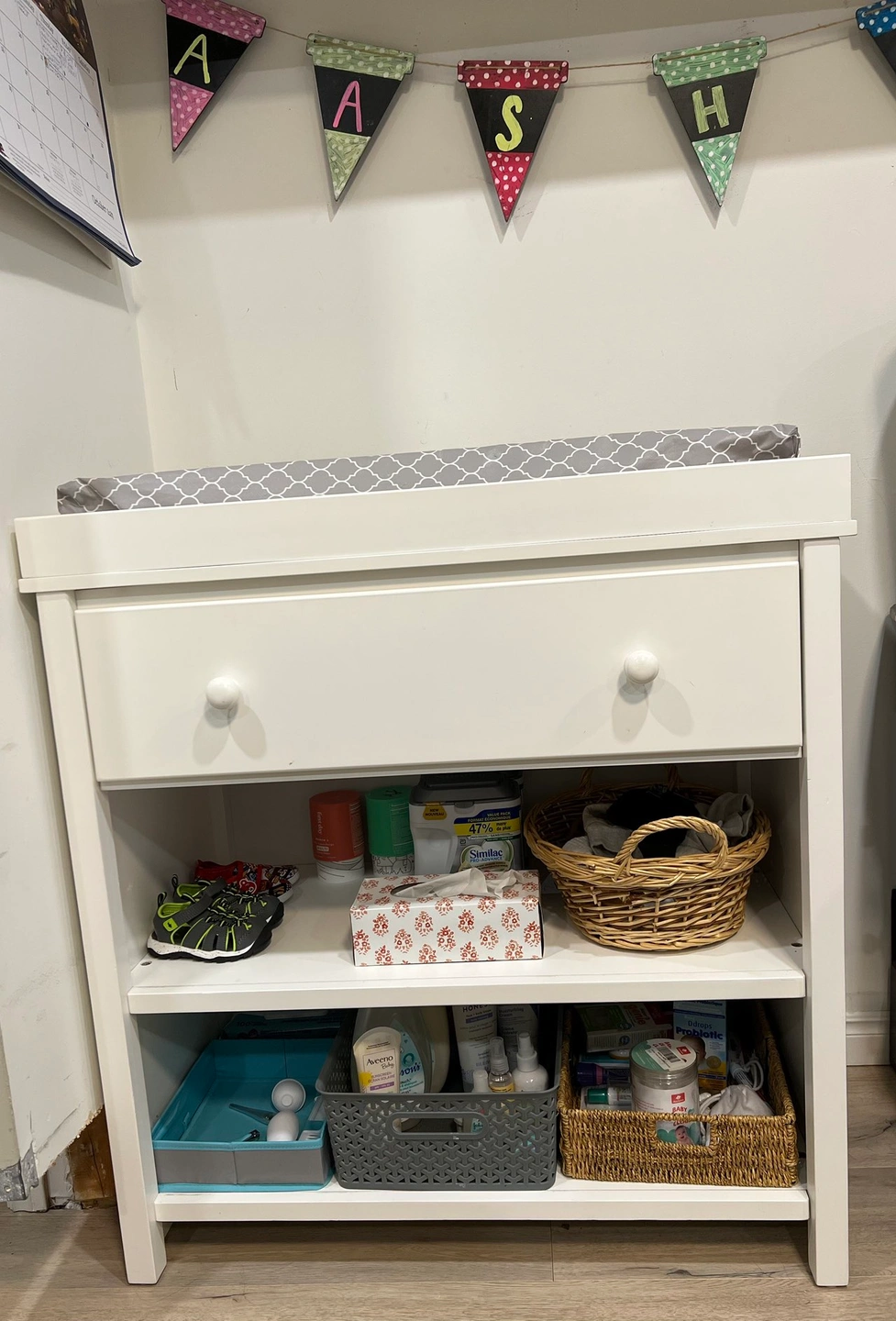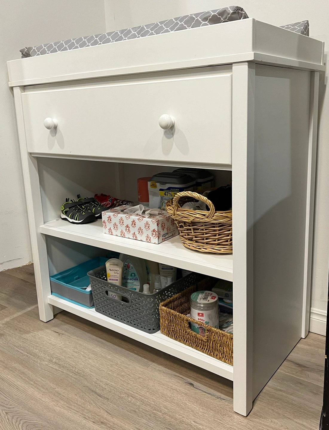 The fisher-Price changing station is the essential piece of furniture to make changing baby easy and convenient. It features a generous area to hold a contour pad with a large drawer and two shelves to keep all of baby’s necessities organized and within reach.
