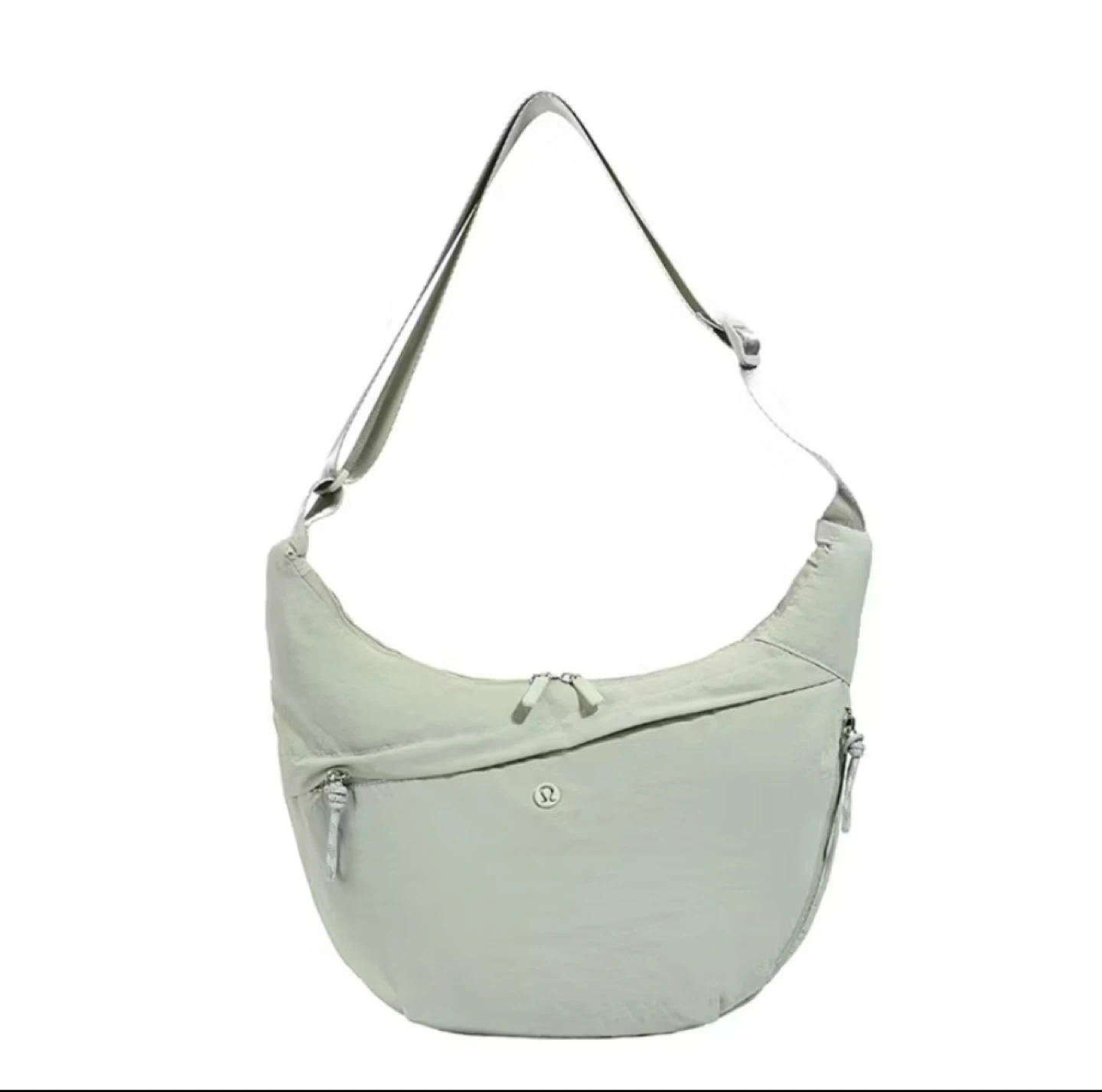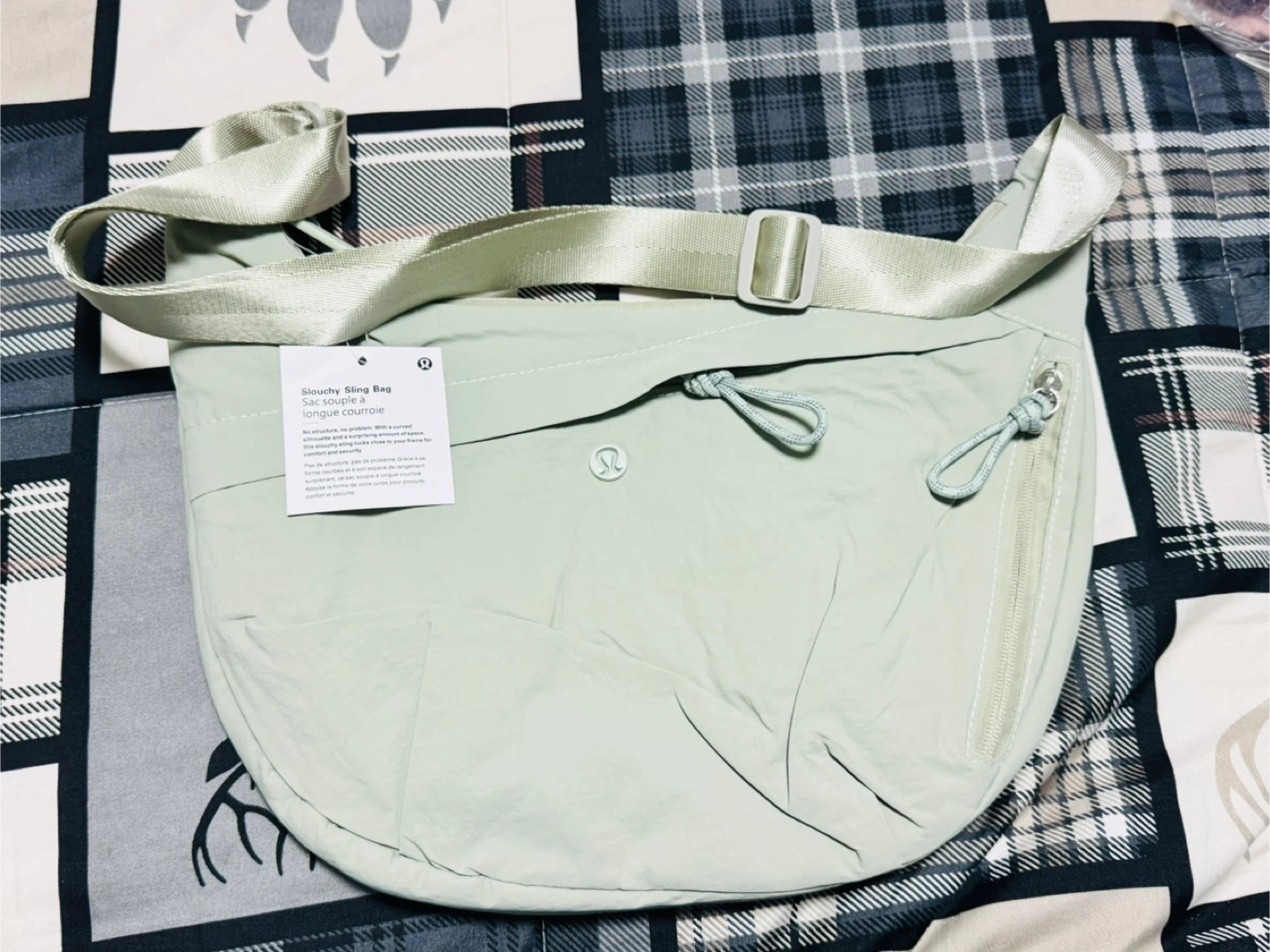This is a Lululemon Slouchy Sling Bag in a light green colour. It's made from a water-repellent fabric. It has multiple zippered pockets for storage. This bag is great for everyday use! Never used, with tag.