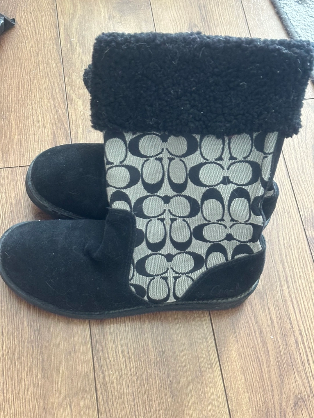 Black suede and canvas boots with signature Coach pattern. Fold-over sherpa cuff.