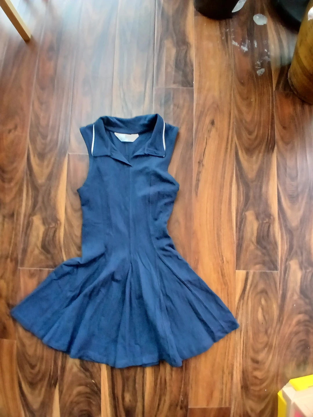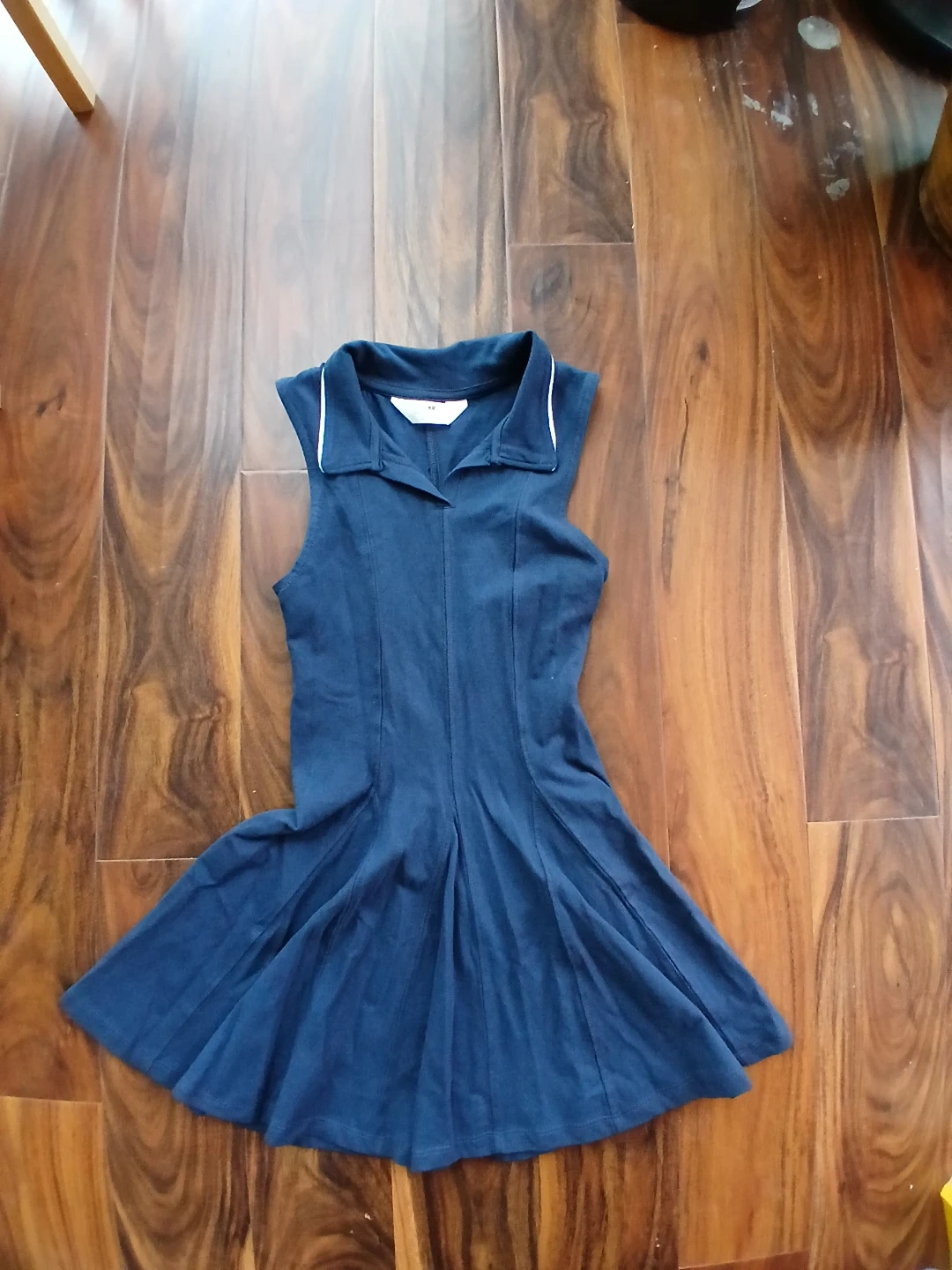 This is a blue sleeveless collared tennis dress from H&M. It features a pleated skirt and is a size 8-10 years. The material is a soft cotton blend.