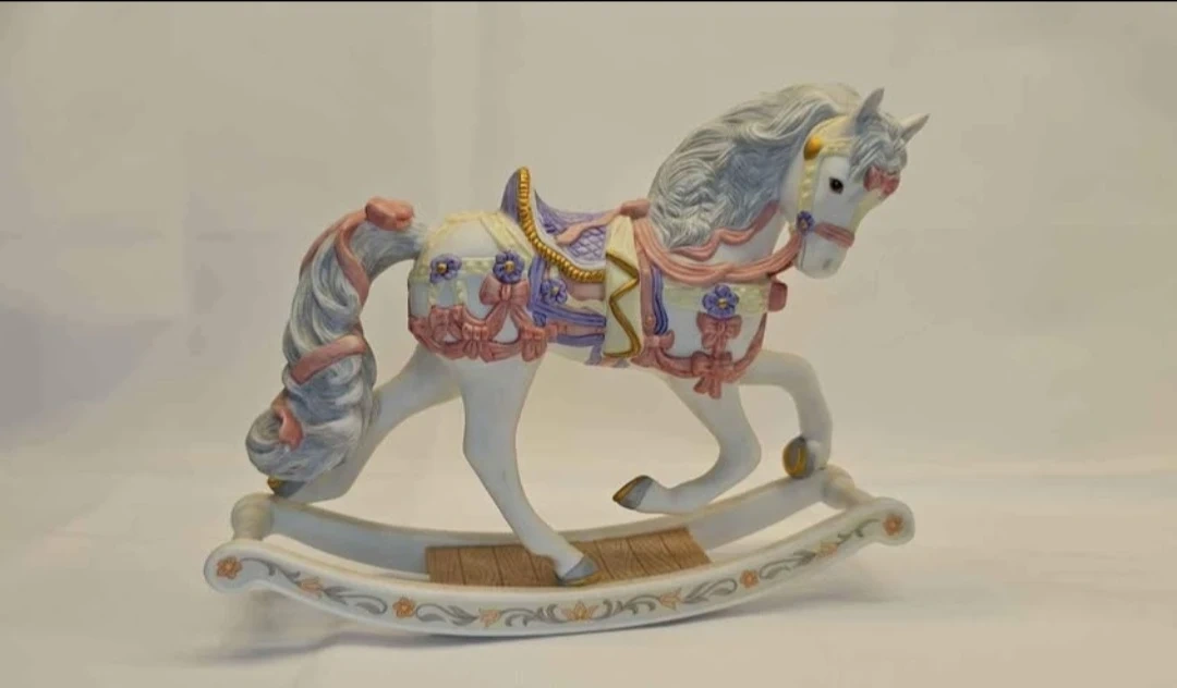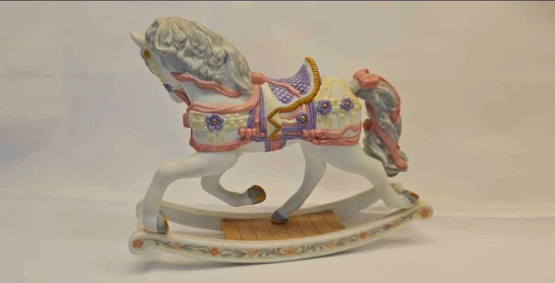 This is a Lenox porcelain rocking horse figurine. It's intricately detailed with a white body, grey mane and tail, and pastel accents on the saddle and bridle. The base is decorated with small floral patterns.