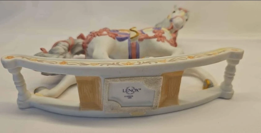 This is a Lenox porcelain rocking horse figurine. It's intricately detailed with a white body, grey mane and tail, and pastel accents on the saddle and bridle. The base is decorated with small floral patterns.