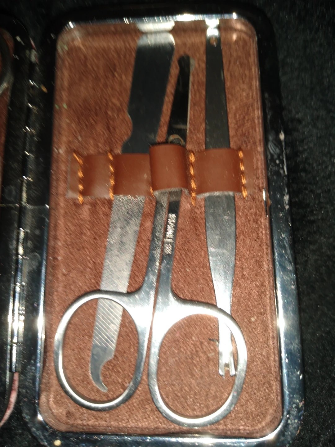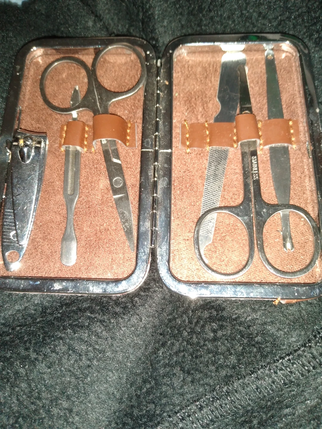 This is a beautiful small compact nail and cuticle kit it can work at home or out for travel it is all stainless steel, very clean and and in perfect condition.
