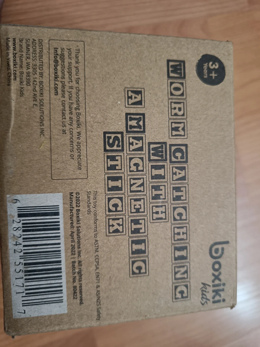 This is a Boxiki Kids worm catching game with a magnetic stick. It's designed for ages 3 and up. The set includes colourful worms and wooden sticks for catching them.