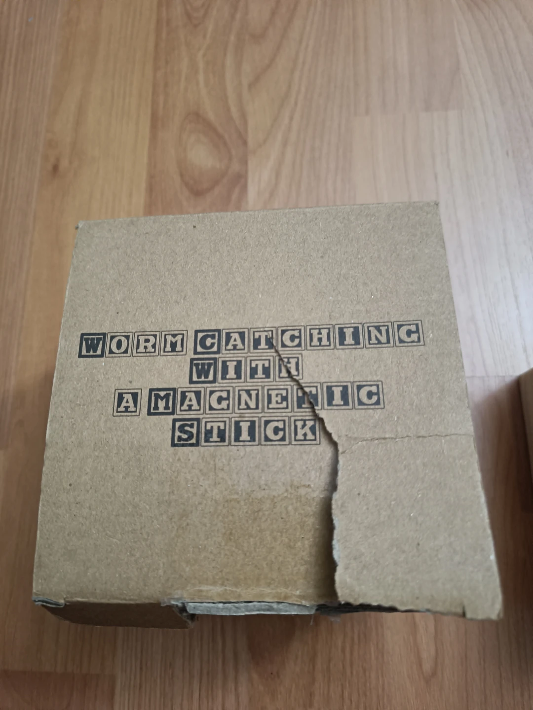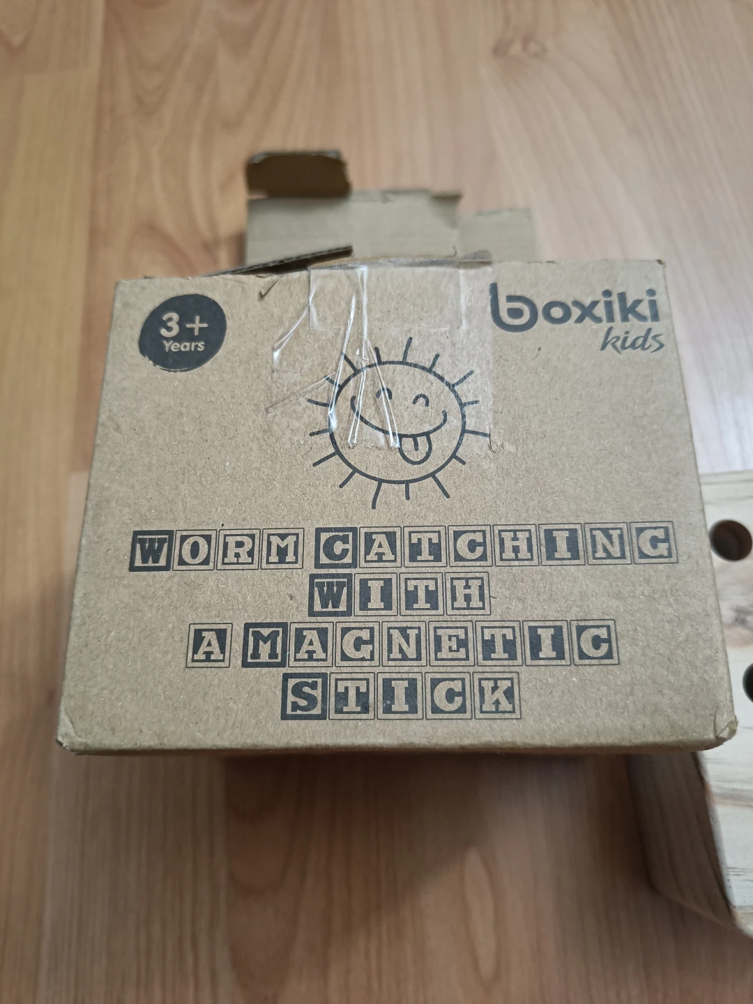 This is a Boxiki Kids worm catching game with a magnetic stick. It's designed for ages 3 and up. The set includes colourful worms and wooden sticks for catching them.