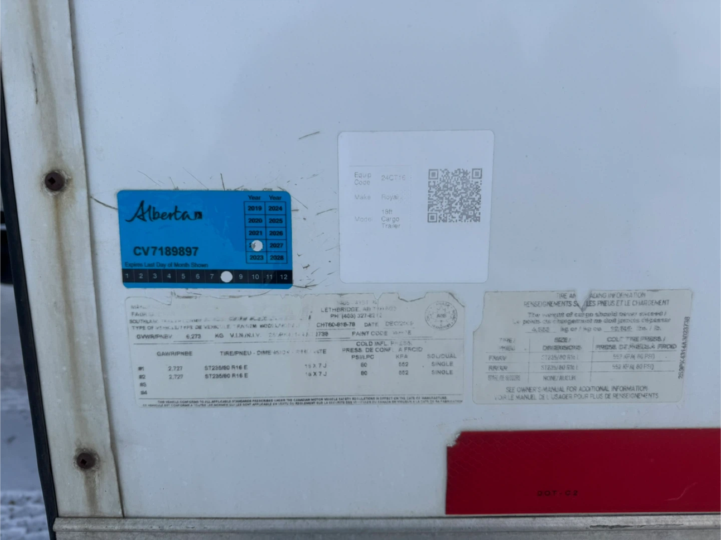 White enclosed cargo trailer. It's a tandem axle with a side door and rear double door. Interior dimensions are approximately 18 feet long. Tires show good tread depth.