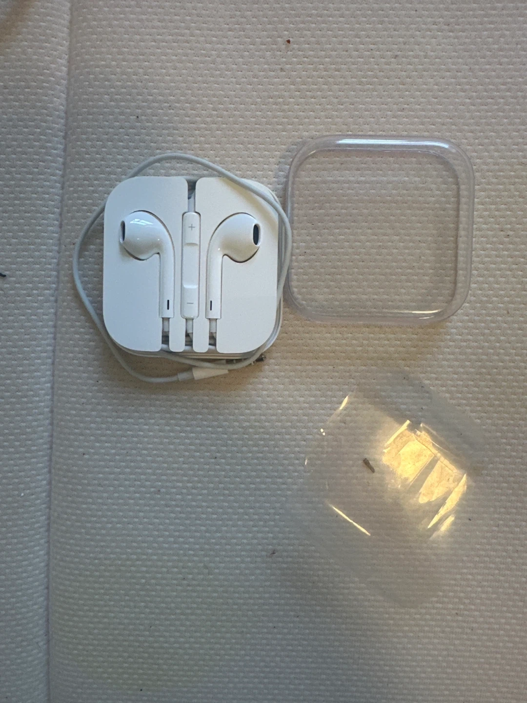 White Apple EarPods with a remote and microphone. Includes a clear plastic storage case. Wired connection with a 3.5mm jack.