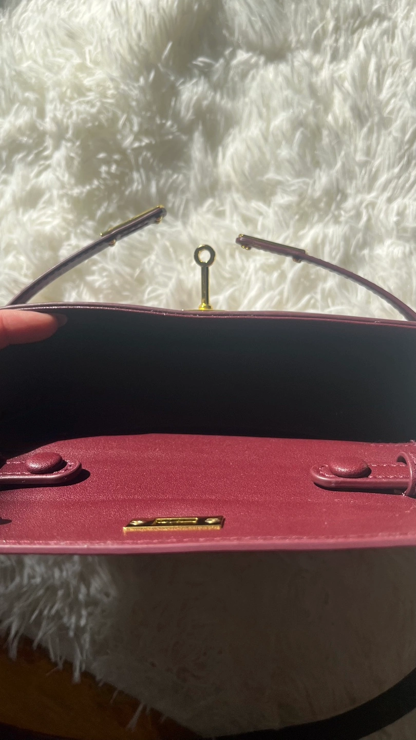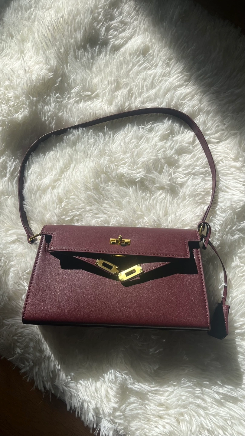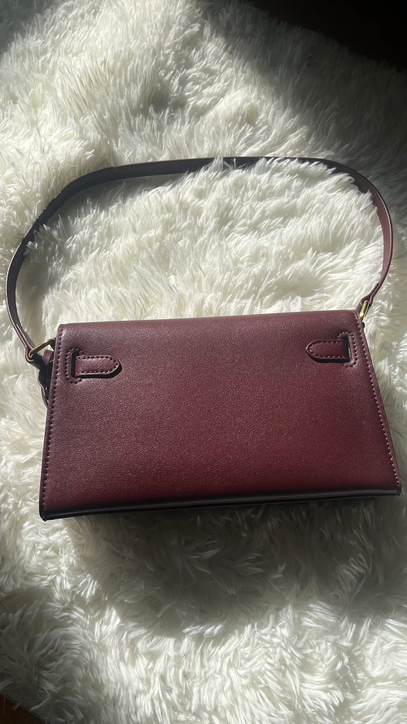 Gorgeous burgundy handbag. Features a flap closure and gold-toned hardware. Comes with one short strap and one long strap. Perfect for everyday use.