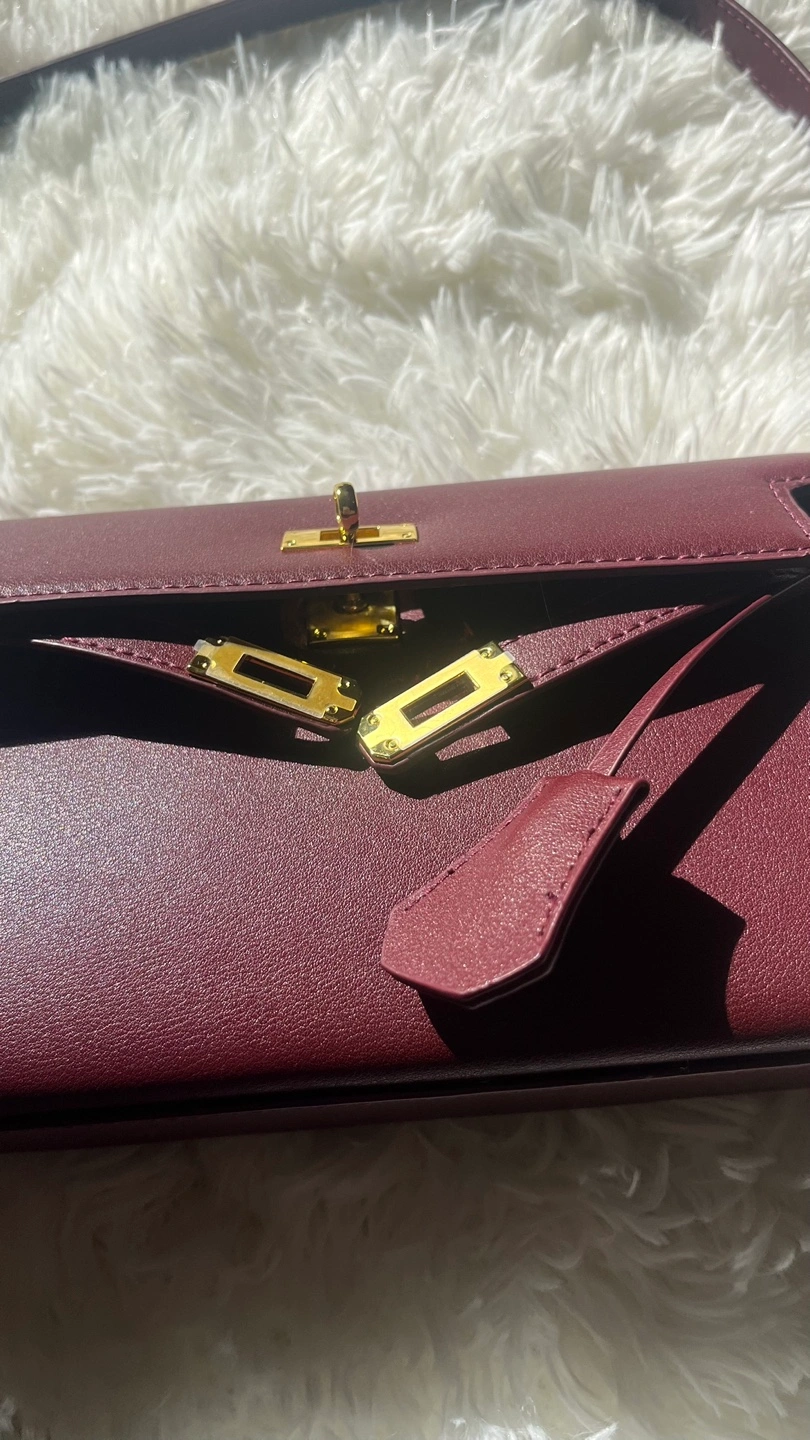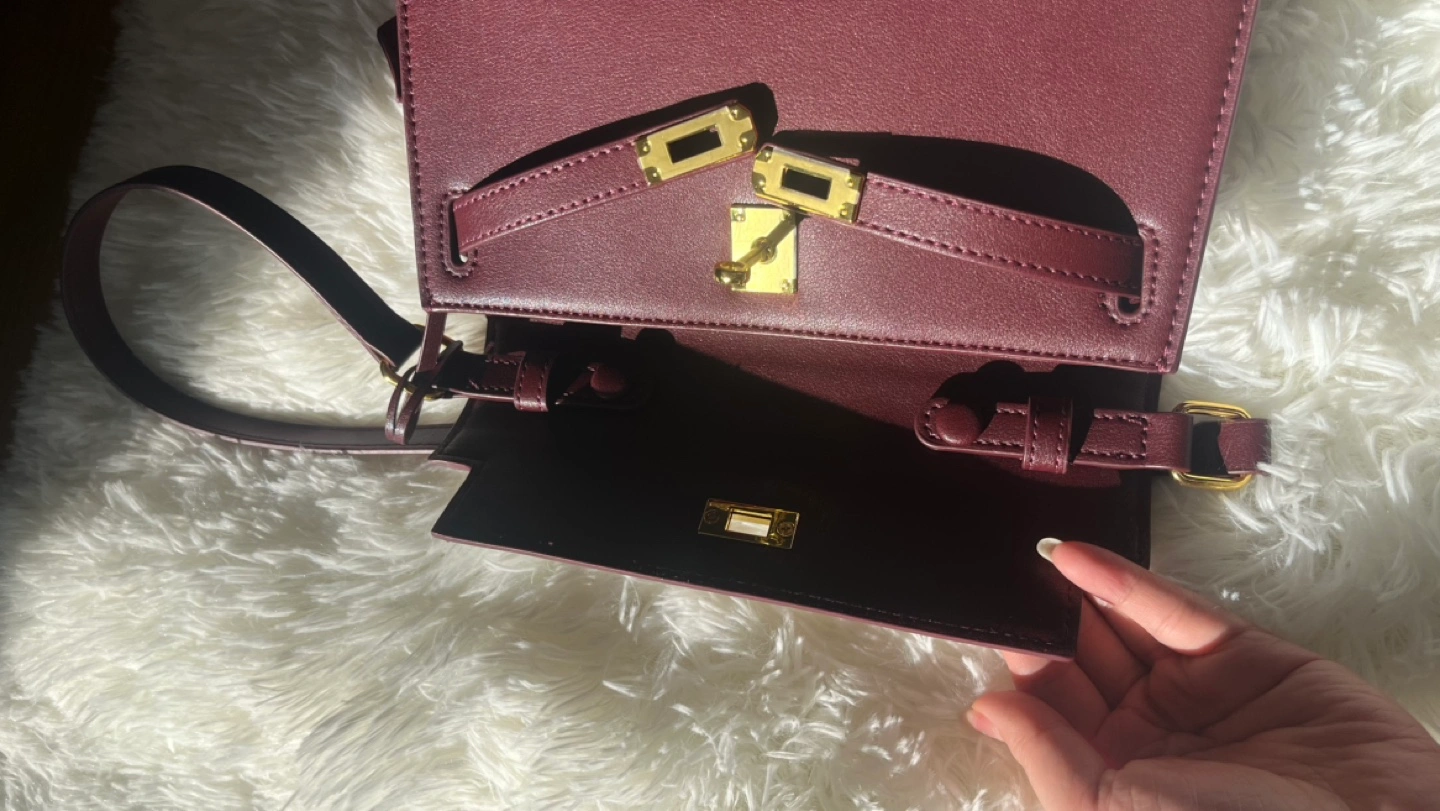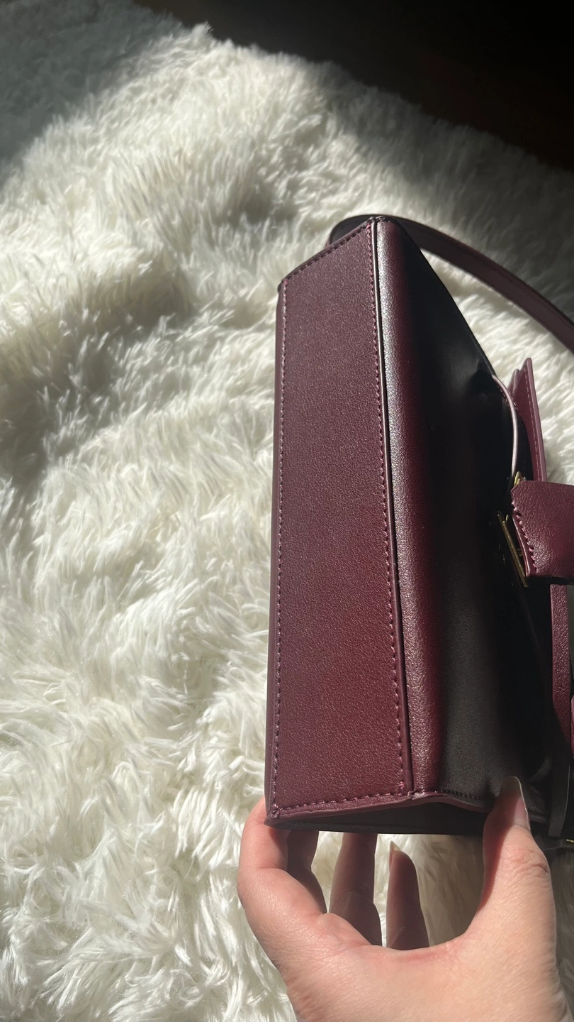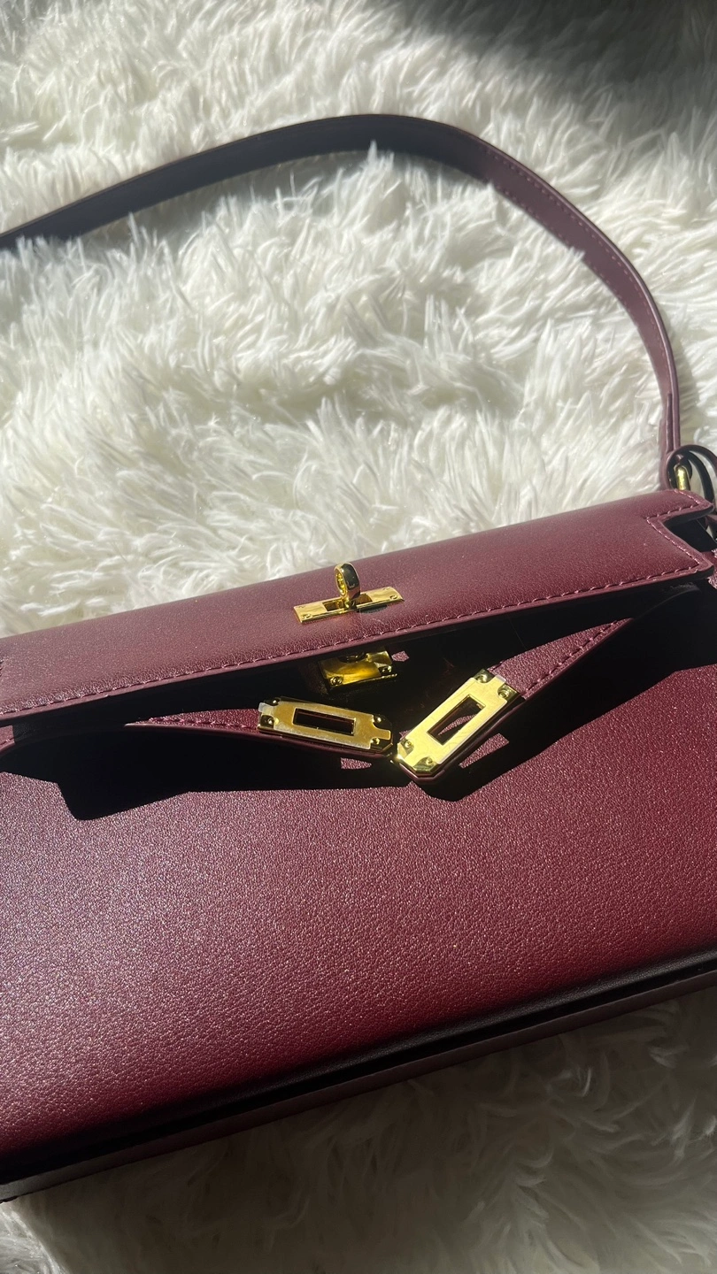 Gorgeous burgundy handbag. Features a flap closure and gold-toned hardware. Comes with one short strap and one long strap. Perfect for everyday use.