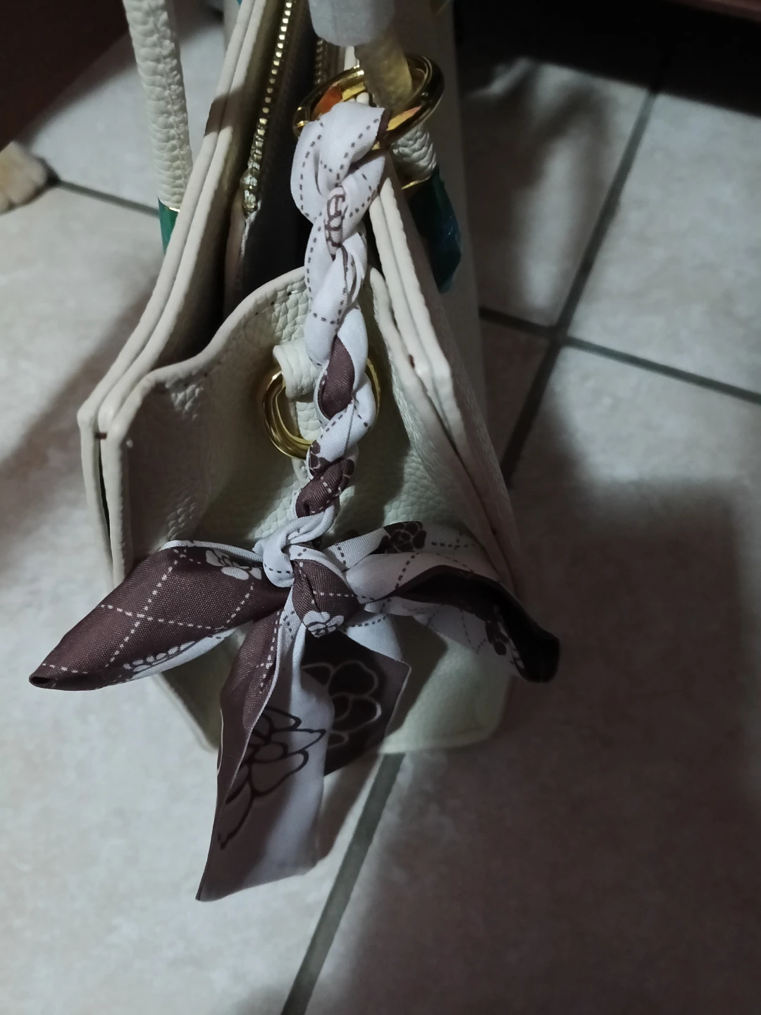 Selling a cute ivory-colored handbag! It features a stylish scarf tied to the handle, adding a touch of flair. The bag has a zippered closure and a spacious interior with multiple compartments. Perfect for everyday use or a special occasion!