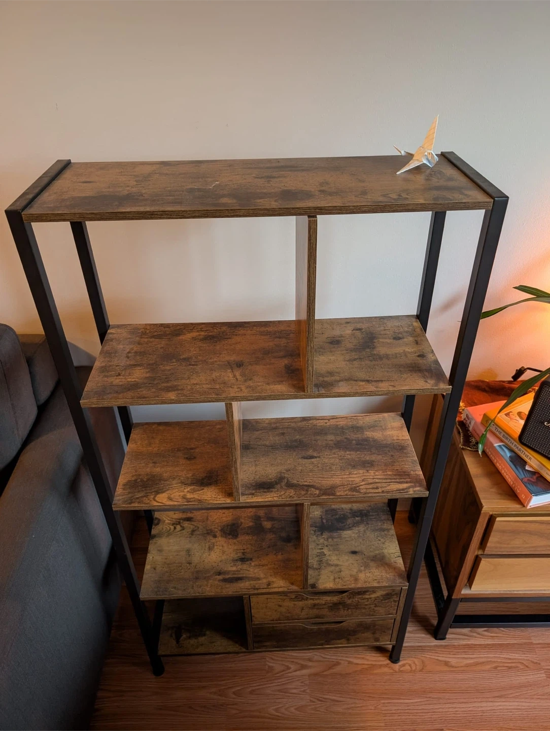 Selling an industrial brown bookshelf with black metal frame. It has a few shelves and two drawers.