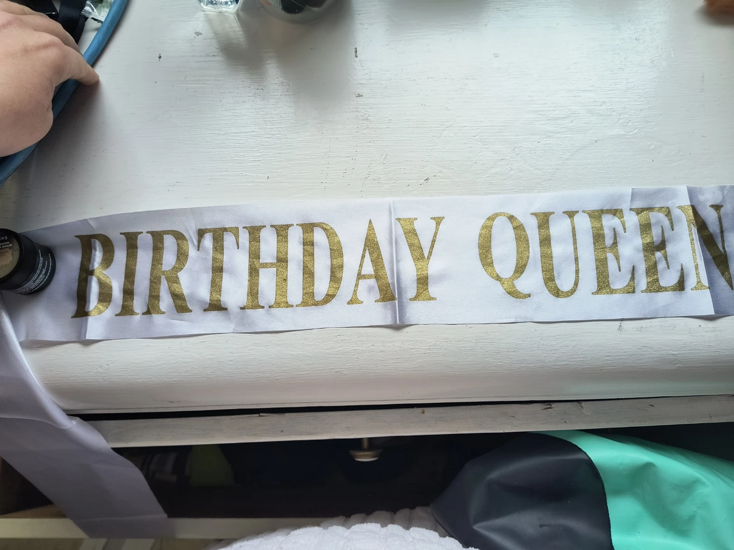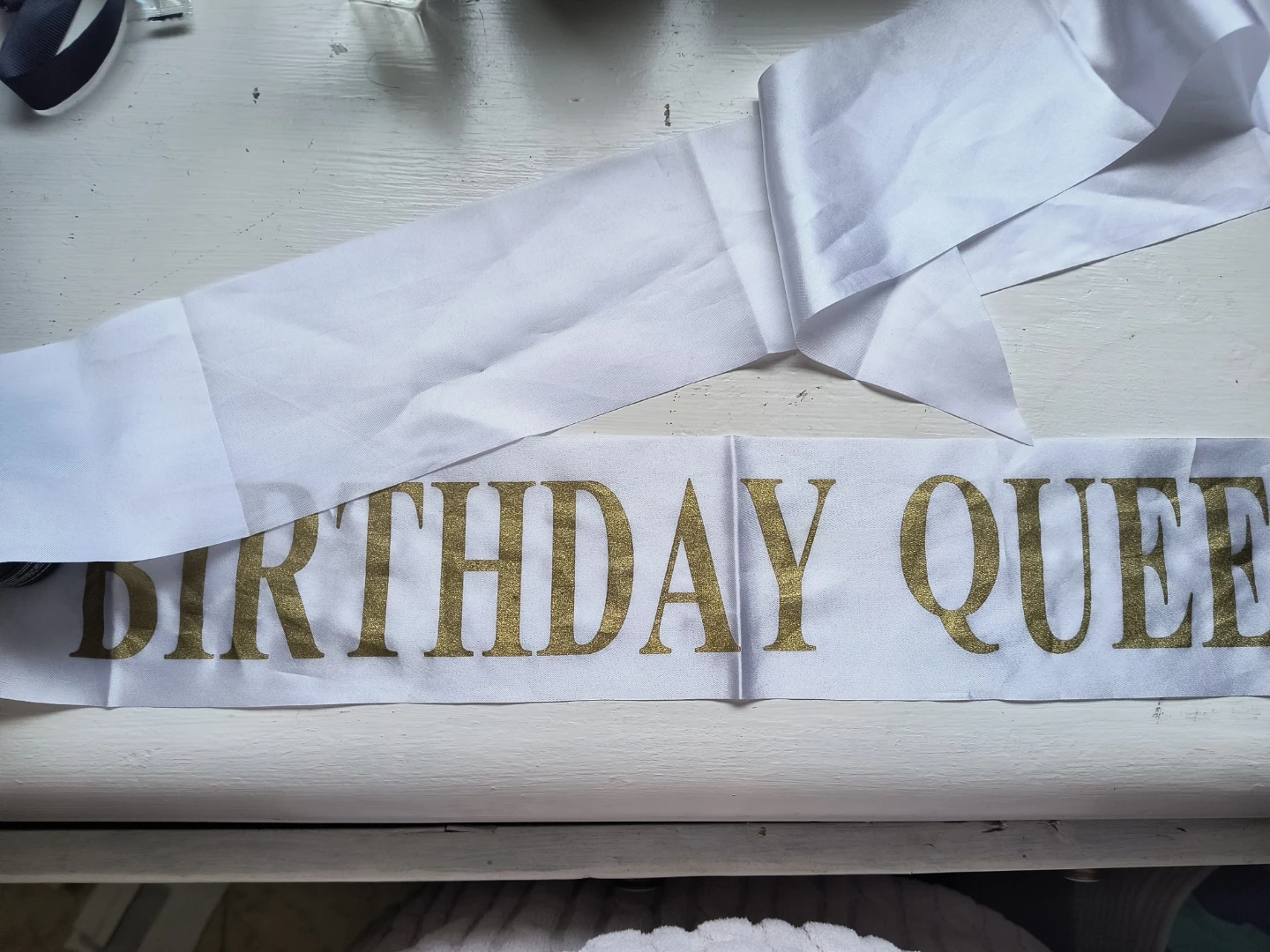 This white sash with gold lettering says "BIRTHDAY QUEEN". It's perfect for celebrating a special birthday! It's made of satin-like material. Bought on amazon