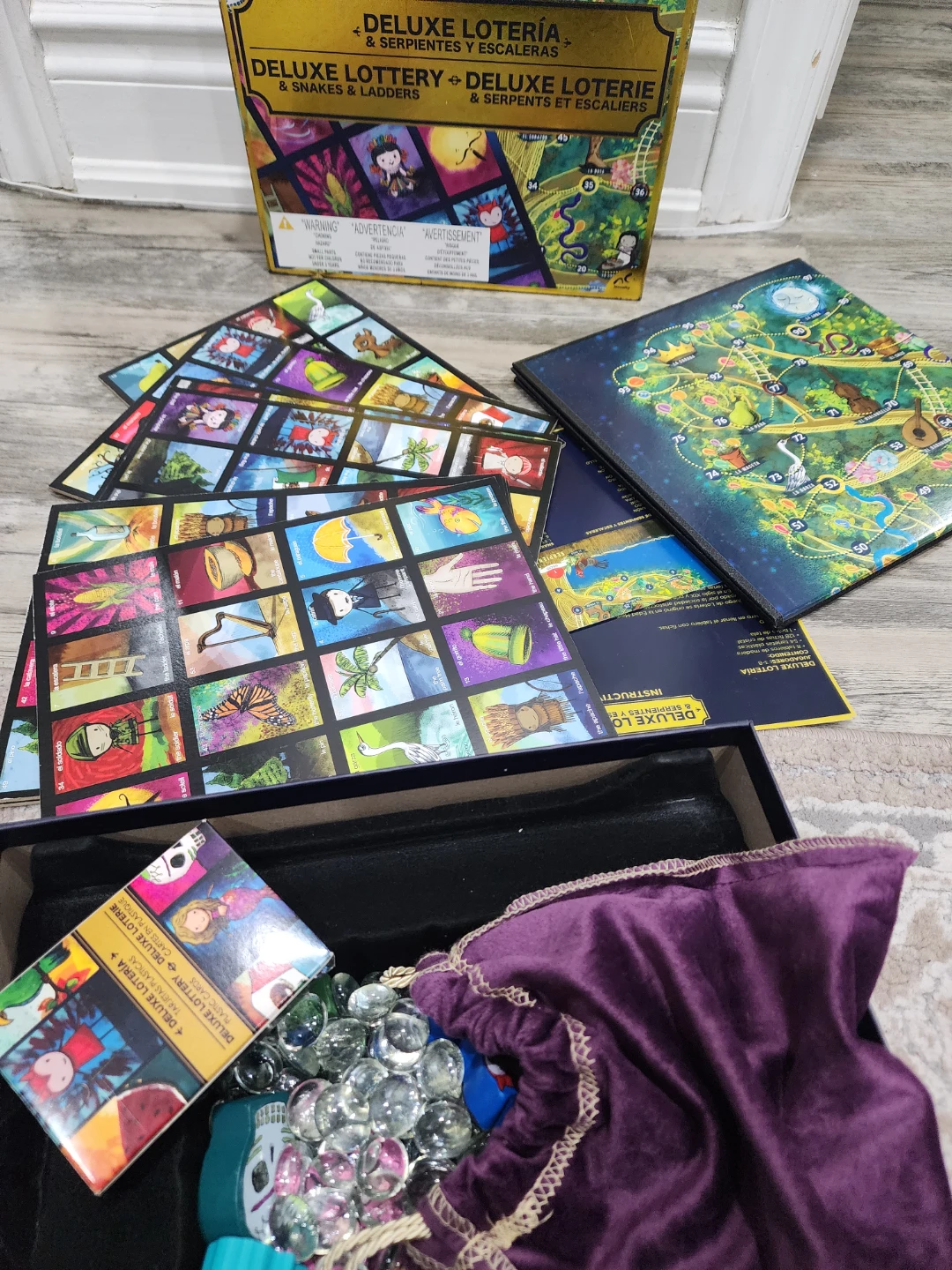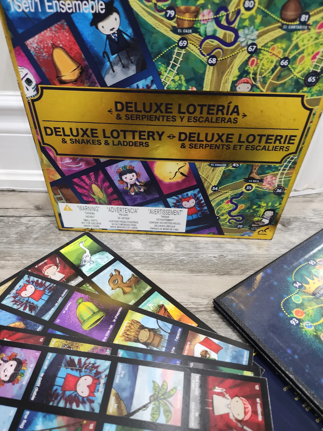 This is a Deluxe Loteria game combined with Snakes and Ladders. It includes game boards, cards, and game pieces in a box. A fun game for family nights!