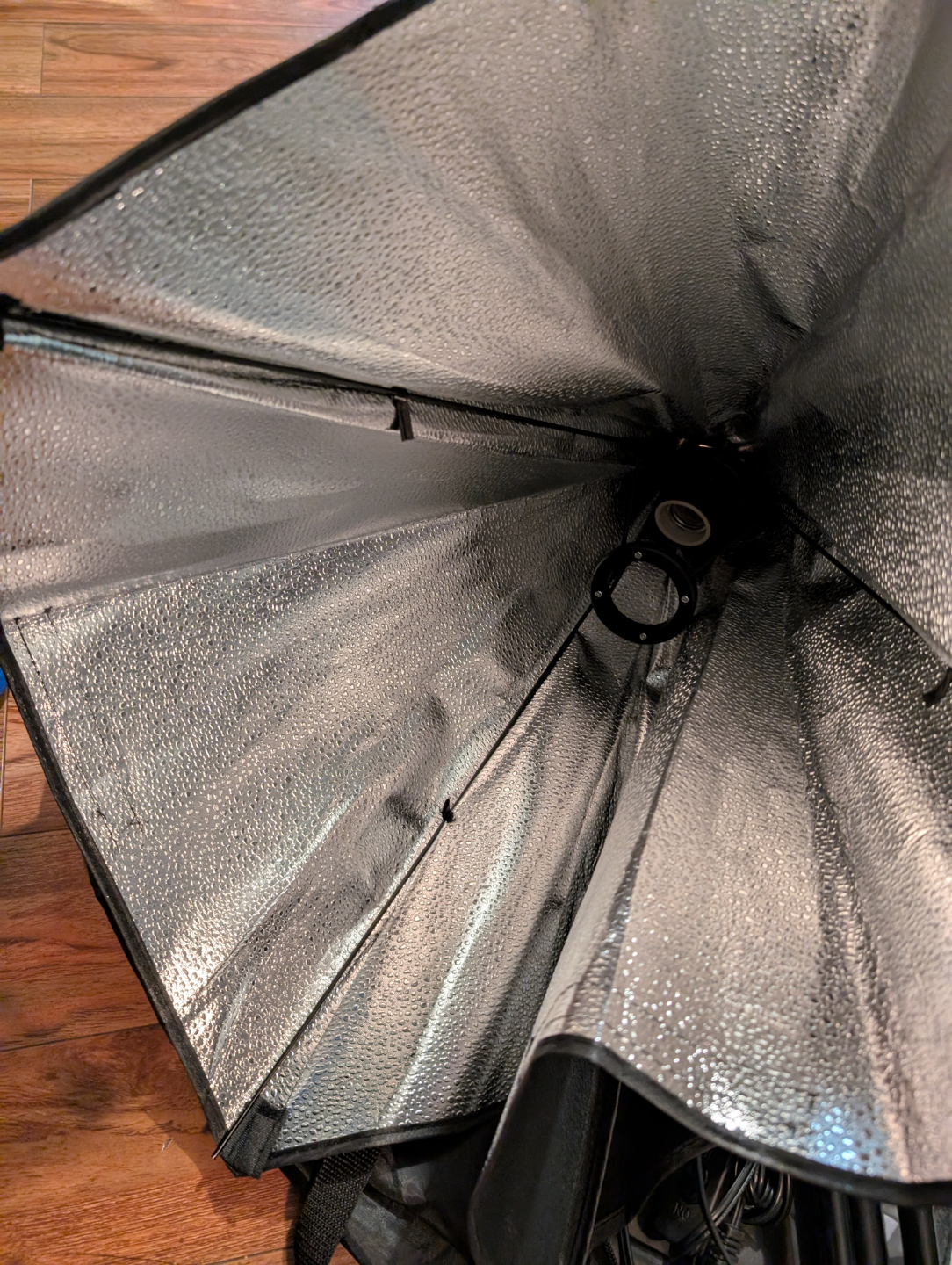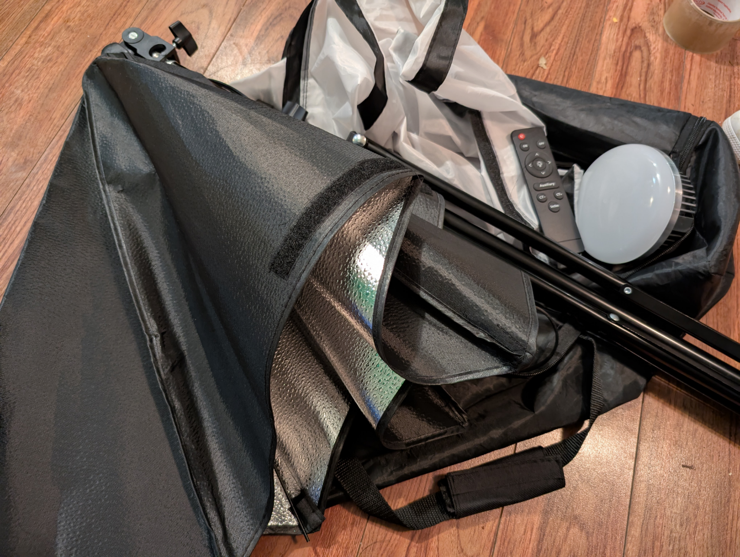 Portable photography lighting kit. Includes light, stand, reflector, and carrying bag. Great for on-the-go photoshoots.