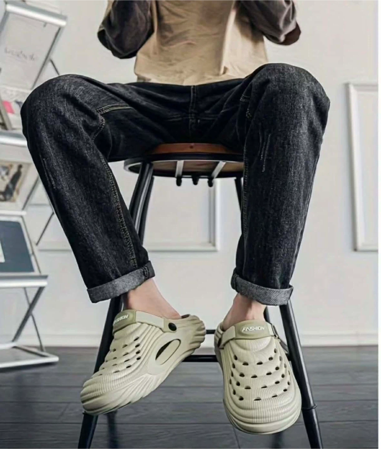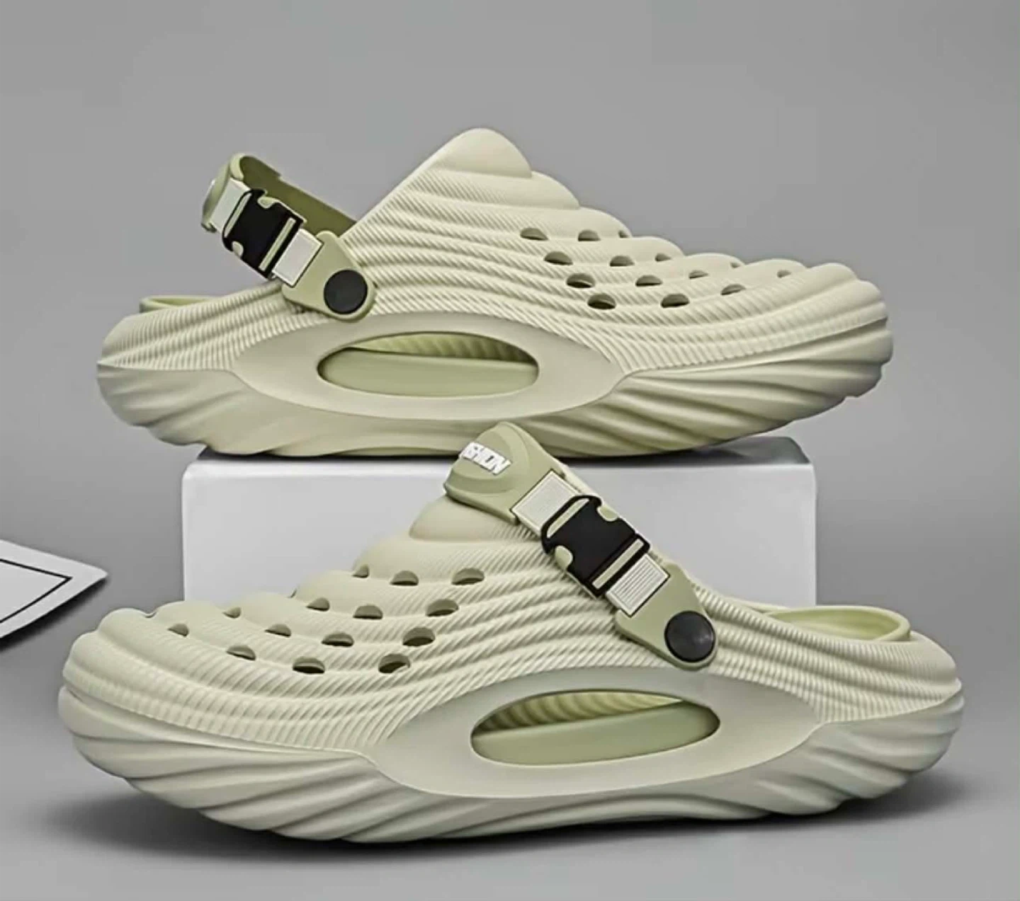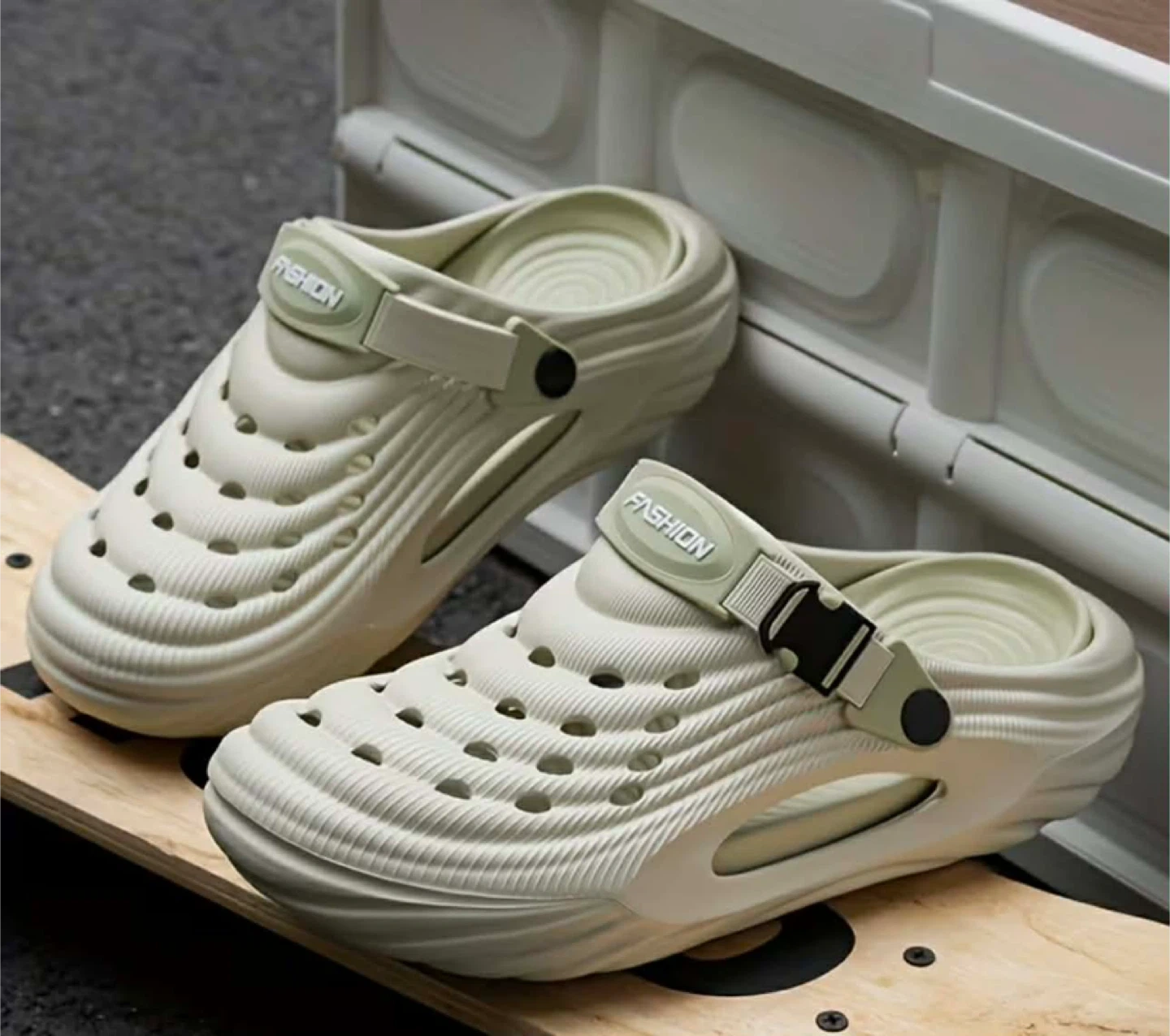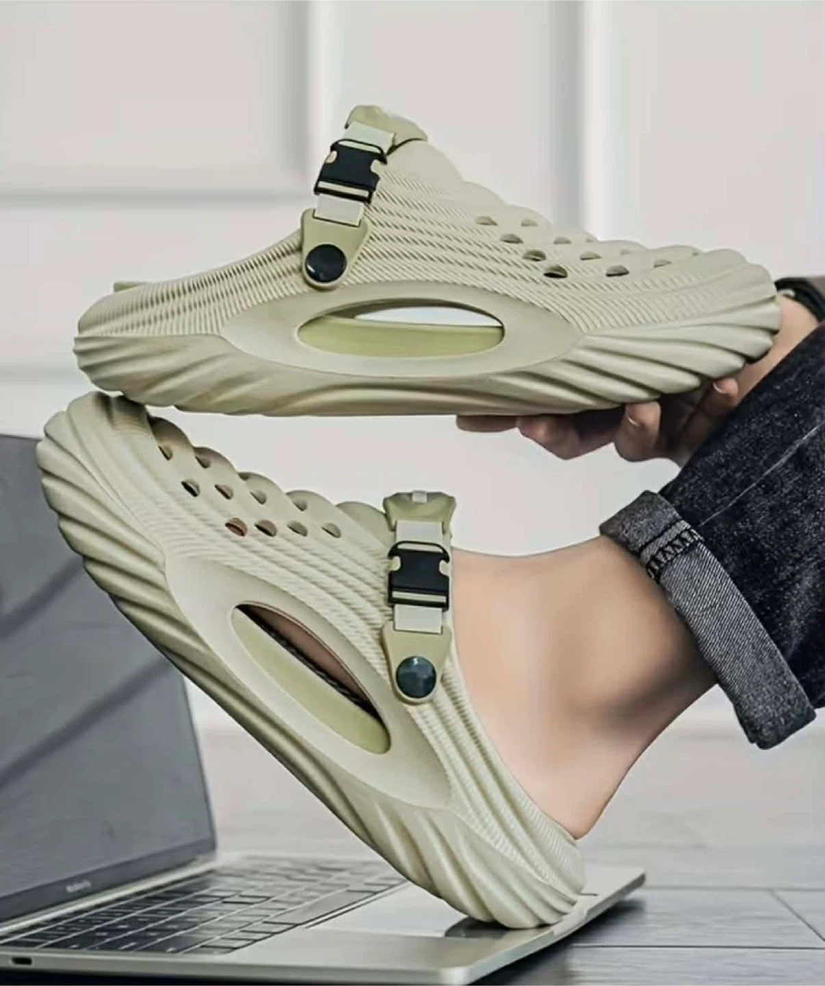 These light beige clogs feature a textured upper with a breathable perforated design. They have an adjustable strap with a buckle closure for a secure fit. Slip-on style for easy wear.