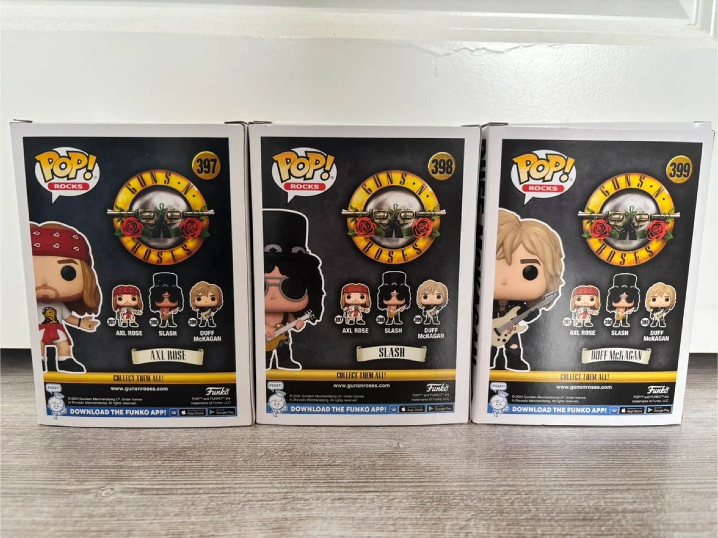 Unopened Full set Collection of three Funko Pop! Rocks vinyl figures featuring Guns N' Roses members Axl Rose, Slash, and Duff McKagan. These figures come in their original boxes.