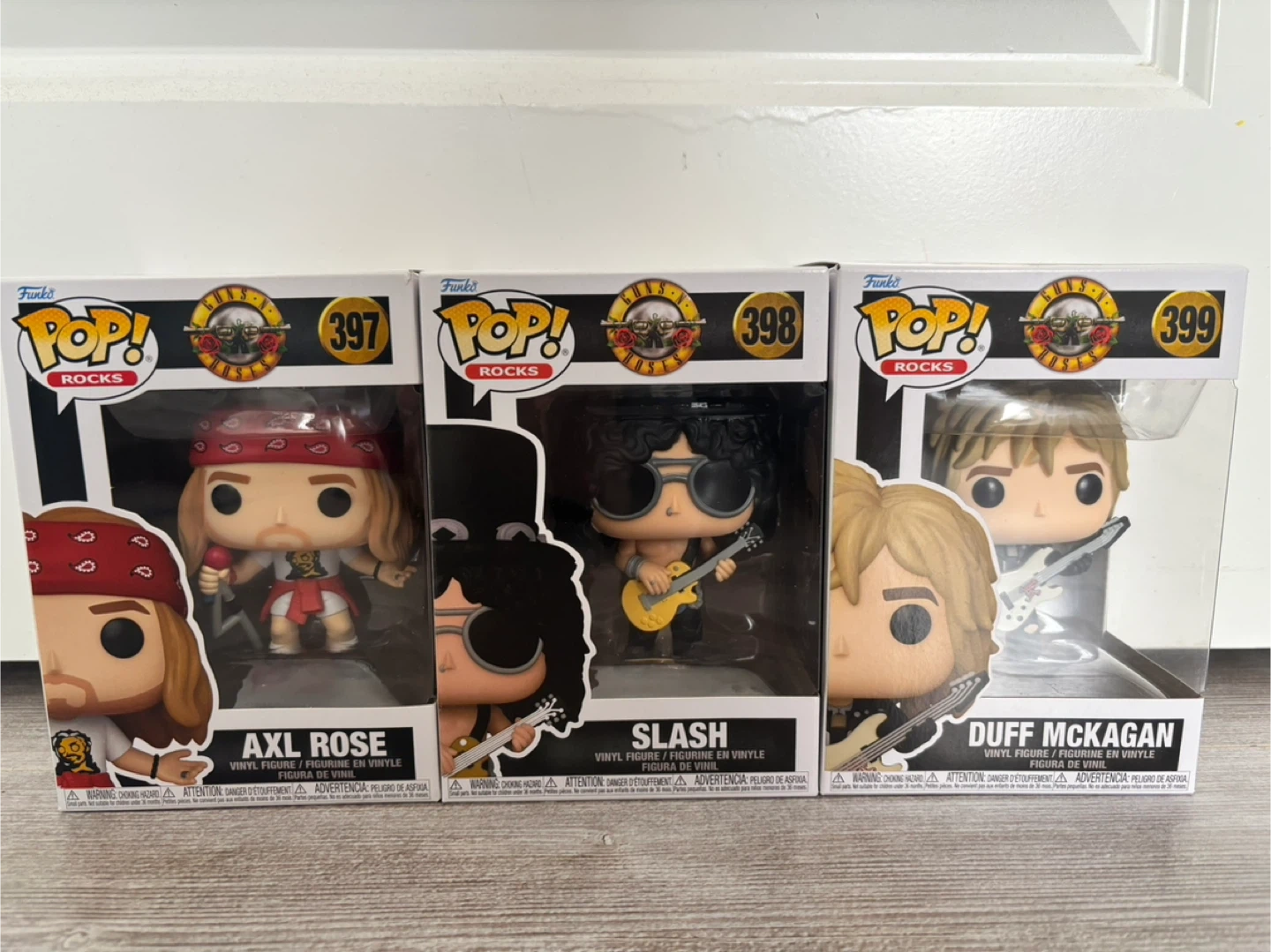 Unopened Full set Collection of three Funko Pop! Rocks vinyl figures featuring Guns N' Roses members Axl Rose, Slash, and Duff McKagan. These figures come in their original boxes.