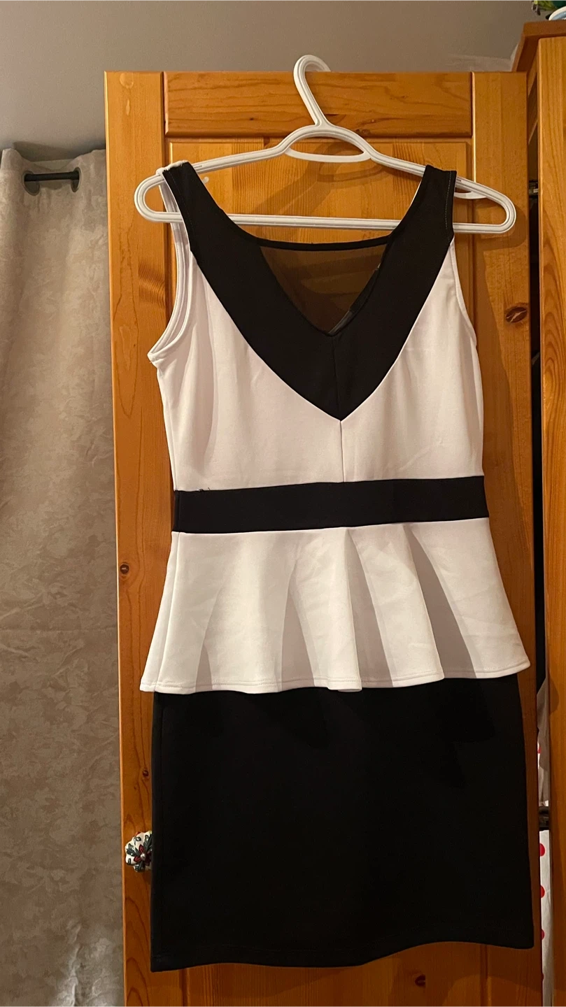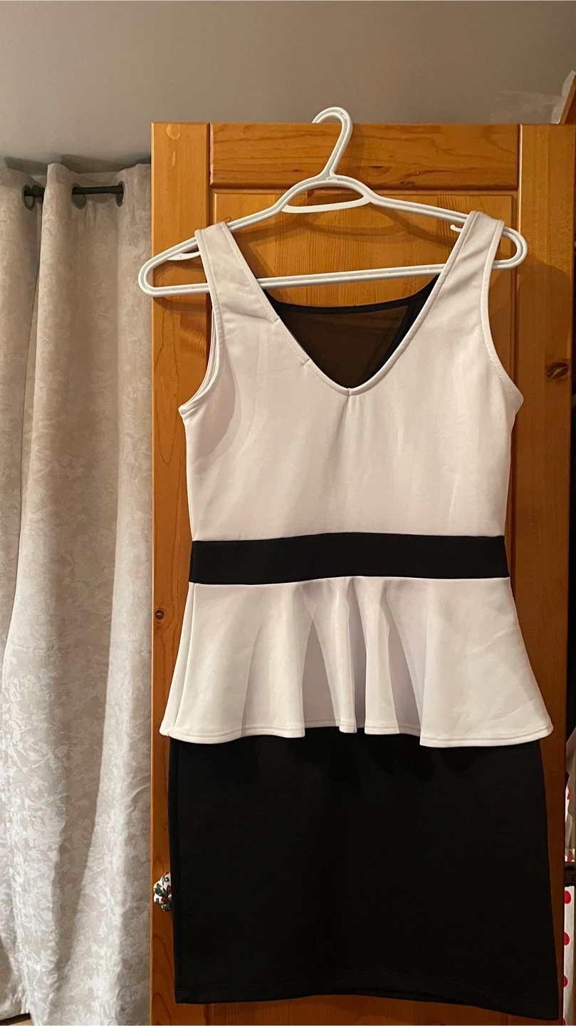 This is a women's peplum dress from Suzy Shier. It's black and white with a V-neck and a sheer inset at the neckline. The dress is size medium.