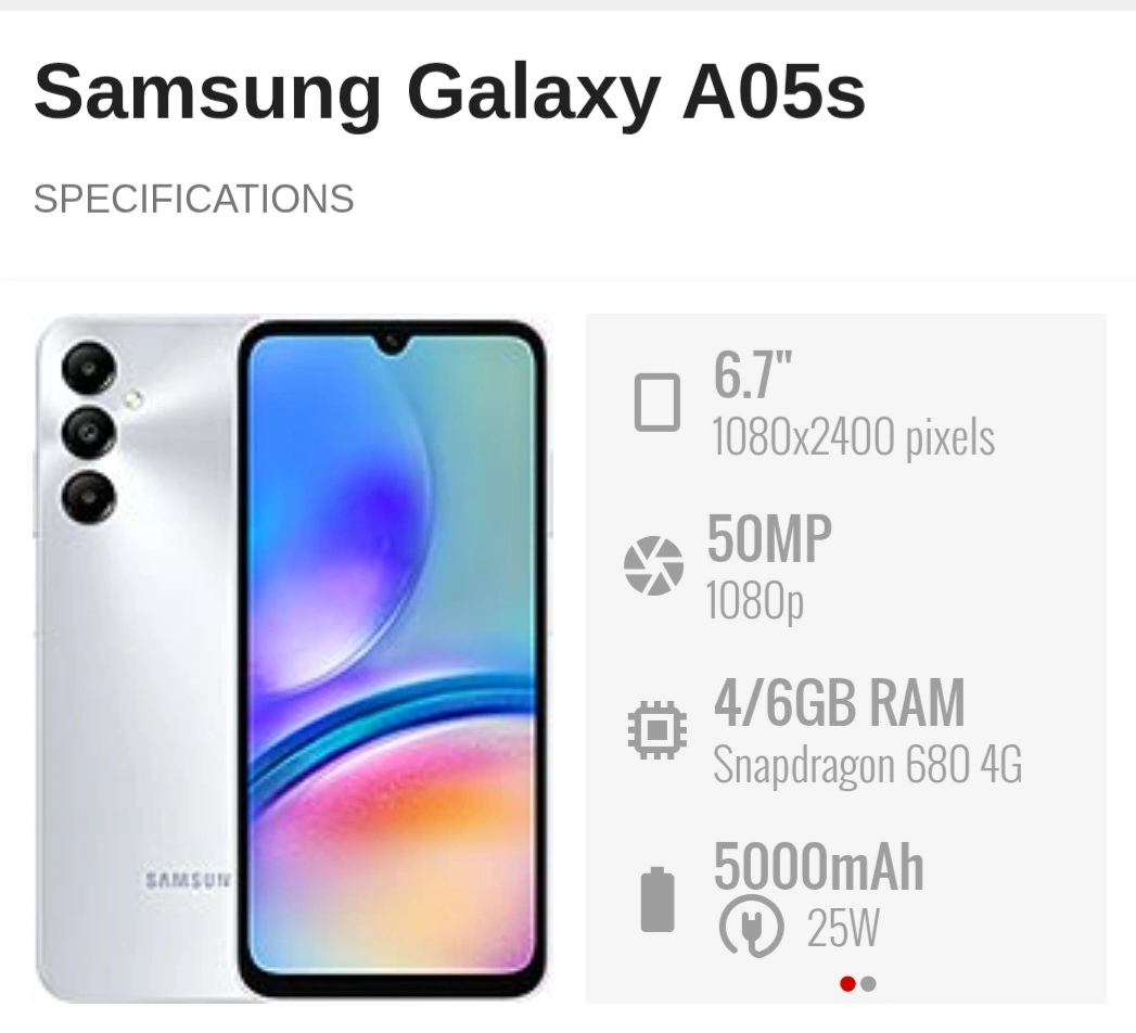 Selling a Samsung Galaxy A05s! It has a 6.7" display with 1080x2400 pixels, 50MP camera, 6GB RAM, and a 5000mAh battery. Comes with the box!
