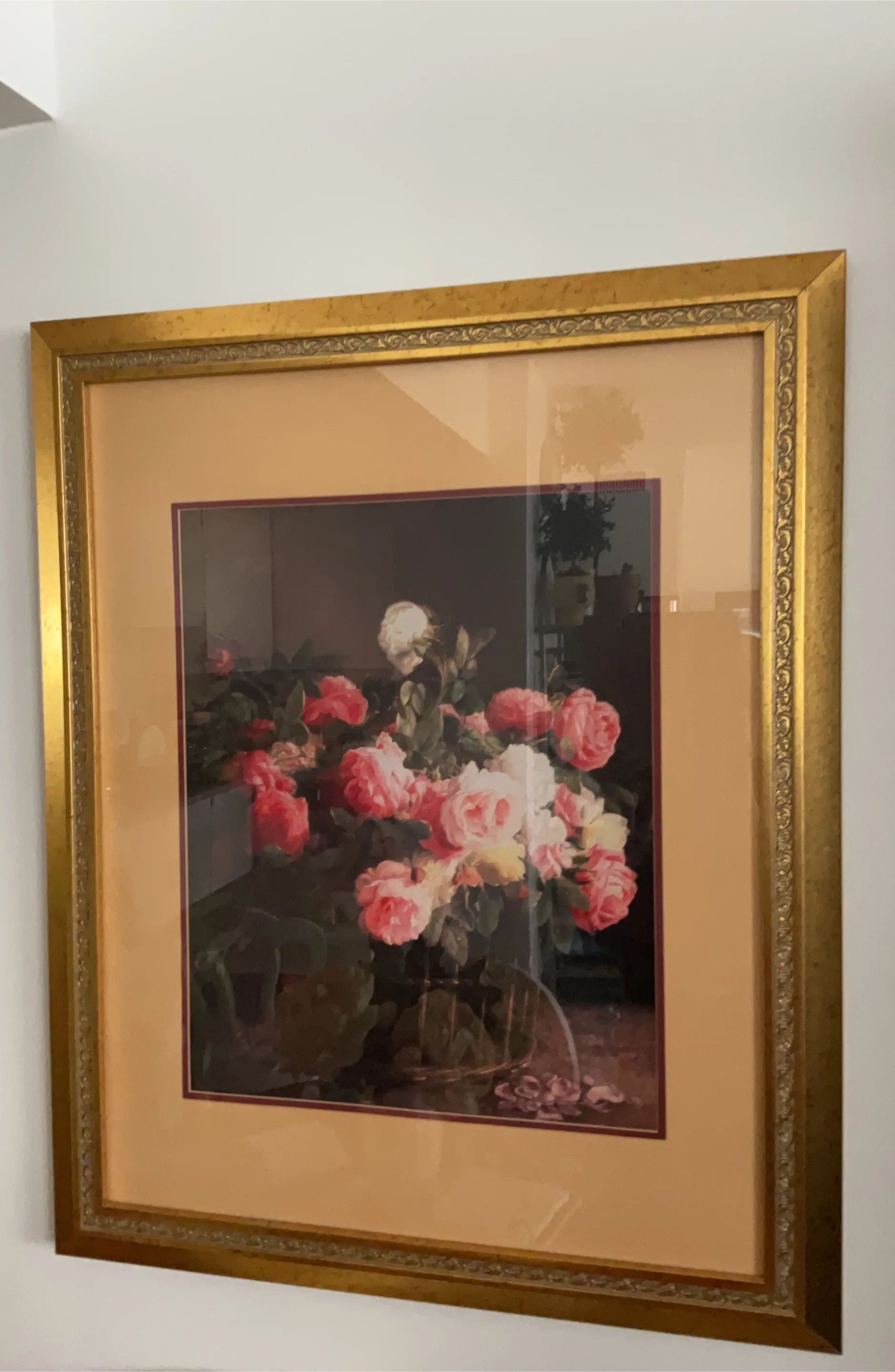 This is a framed print featuring a bouquet of pink and white roses. The artwork is housed in a decorative gold frame with a cream matting. It's ready to hang and add a touch of classic beauty to any room. The detailed depiction of the roses is lovely!