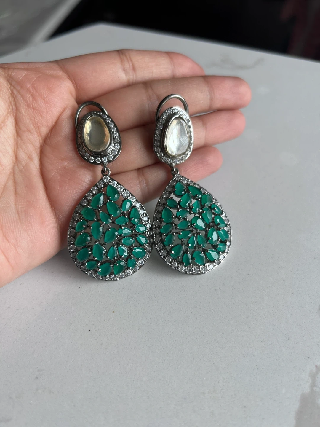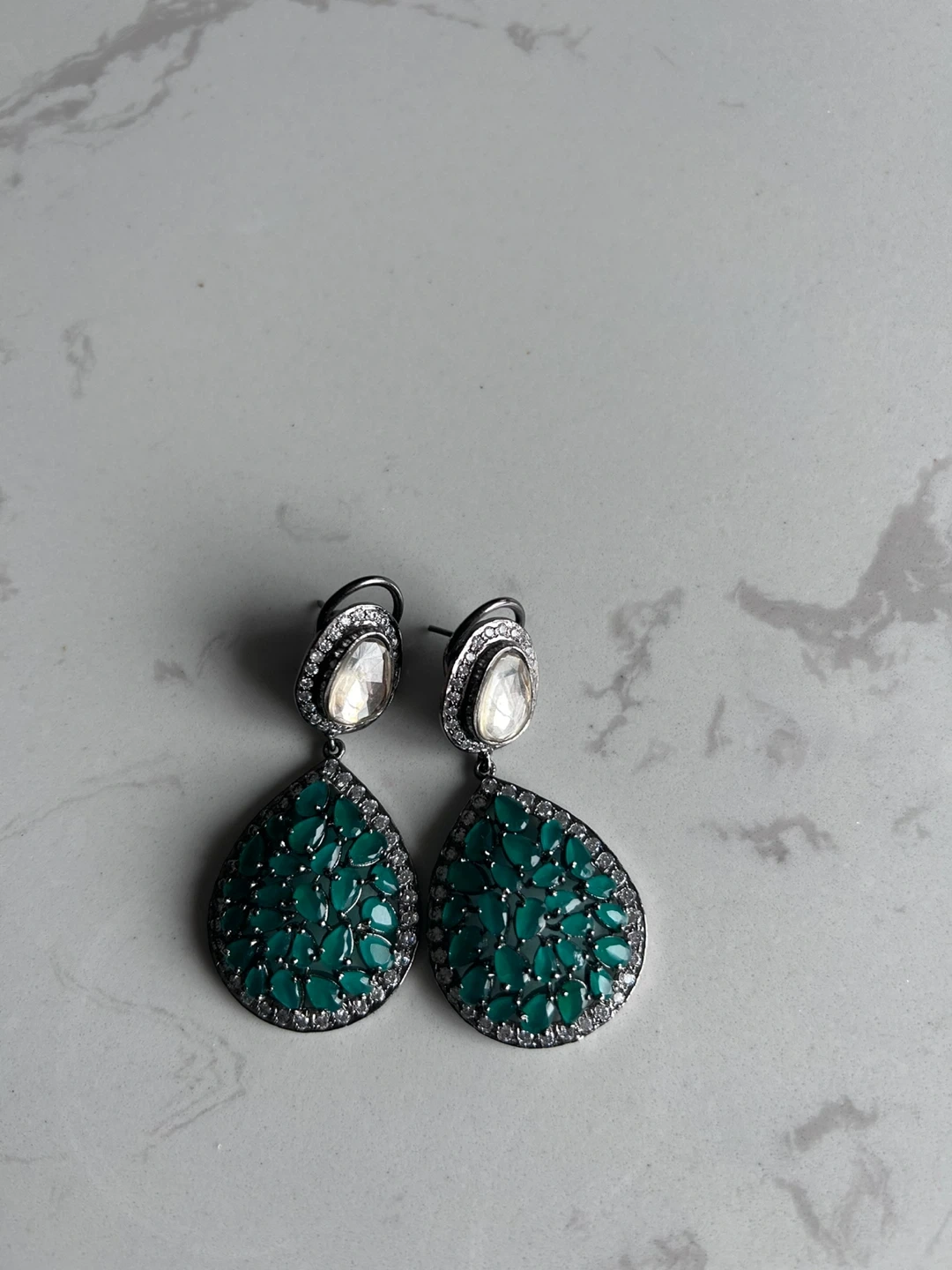 Beautiful teardrop dangle earrings featuring deep emerald green stones surrounded by sparkling clear accent stones. The top of each earring has a white oval stone and a smaller clear stone detail. These are a lovely statement piece for any occasion!