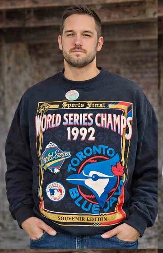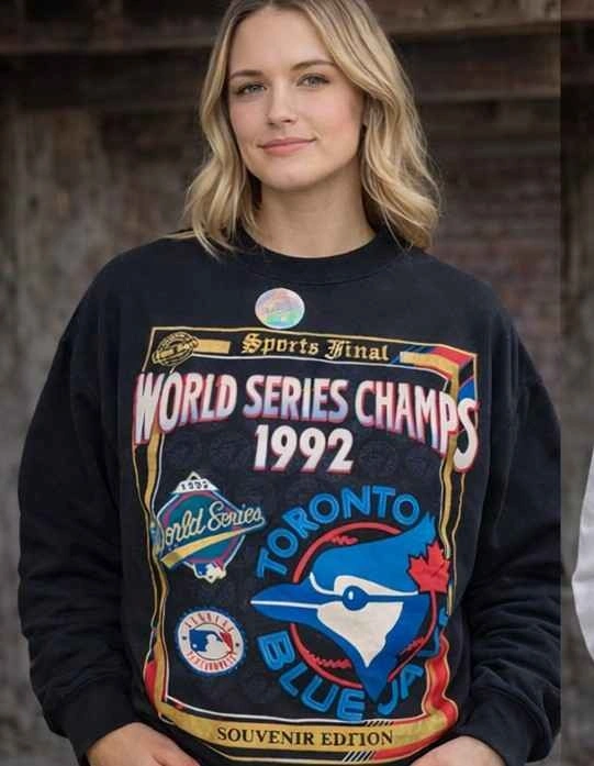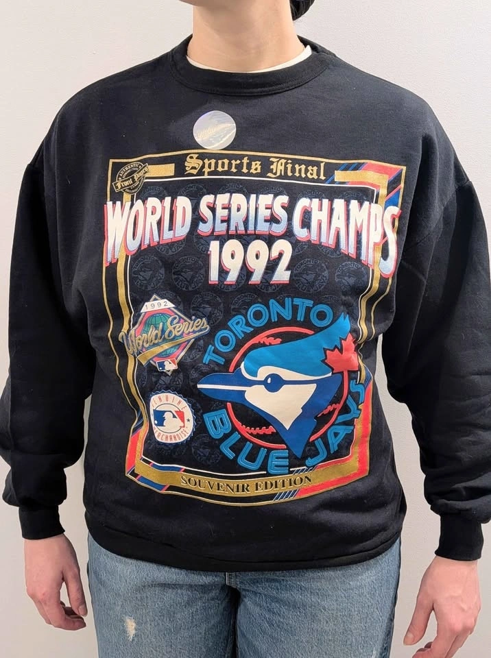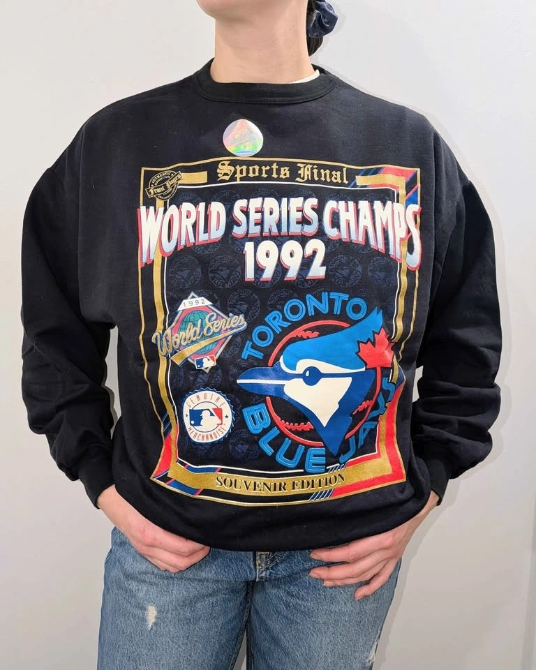 This is a very dark navy crewneck shirt celebrating the 1992 Toronto Blue Jays World Series Champions. It's brand new and never worn, still with the original hologram tag. Fits men's size small or women's size medium.