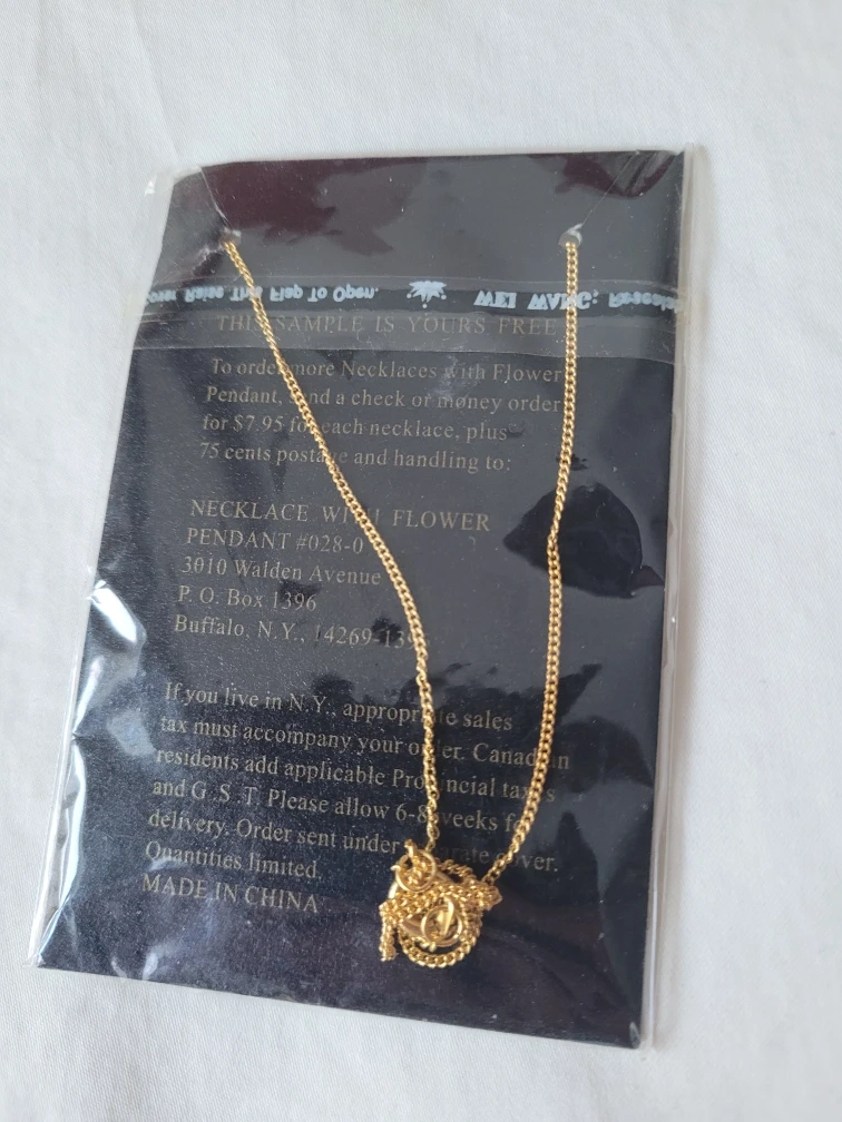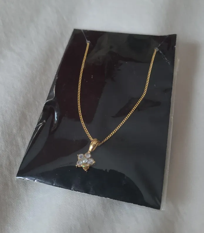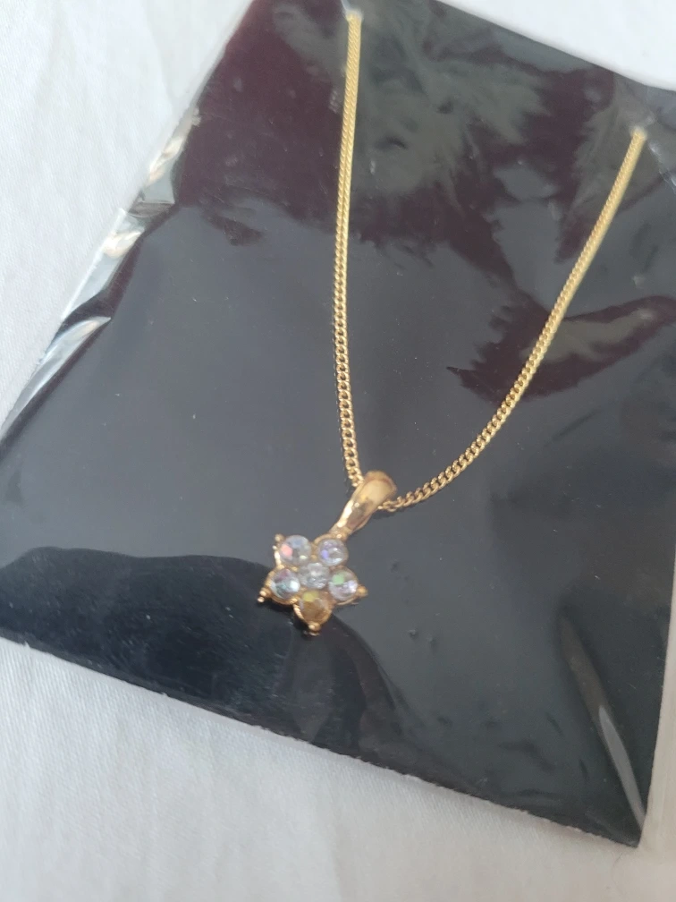 A dainty gold-toned necklace with a flower pendant. The pendant features small, colourful stones. This necklace is new and comes in its original packaging. It's perfect for adding a touch of sparkle!
